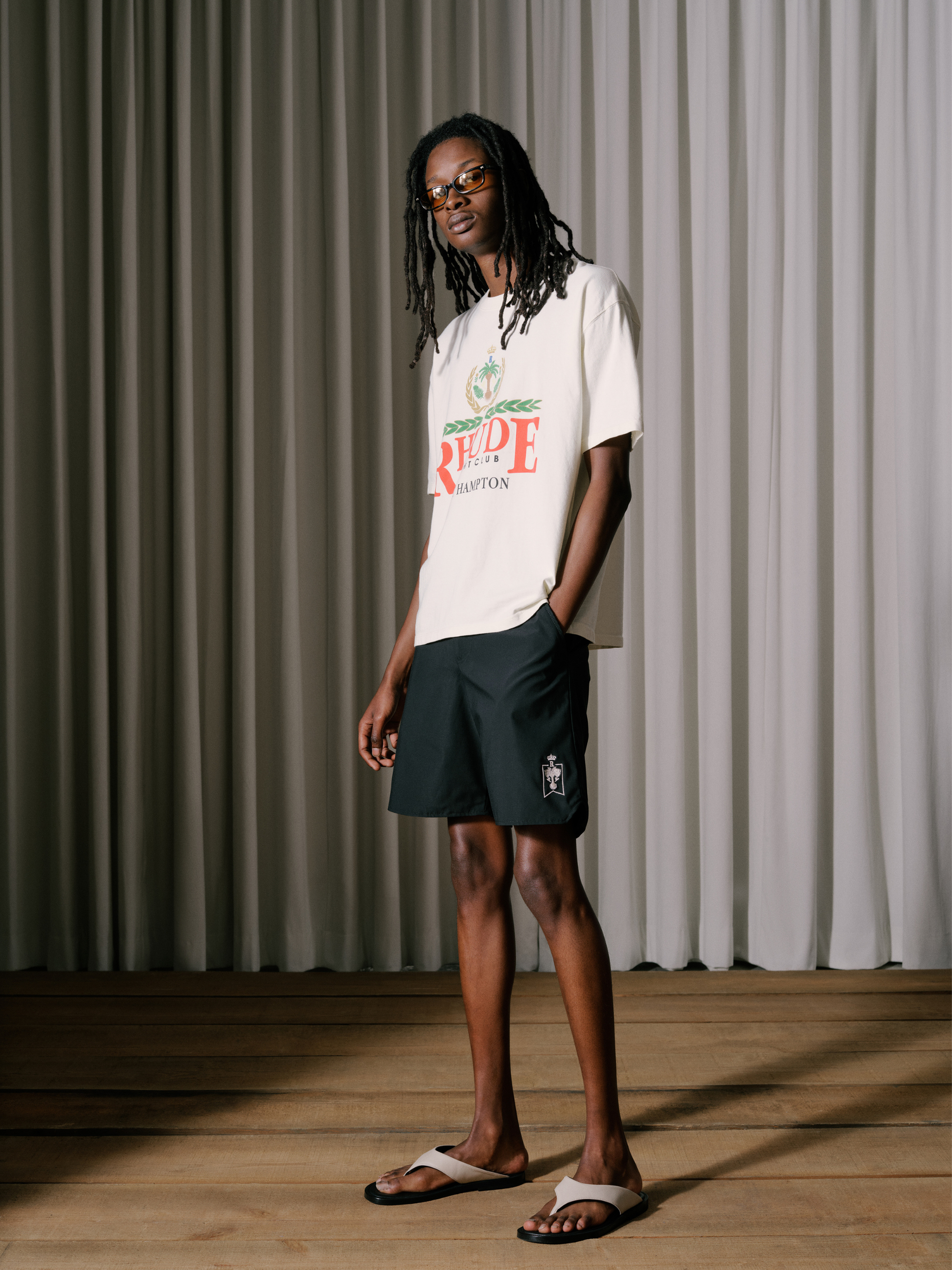 Amalfi board shorts feature a tailored waistband, twin side pockets, and a single back pocket. The Rhude crest is embroidered on the front left leg.