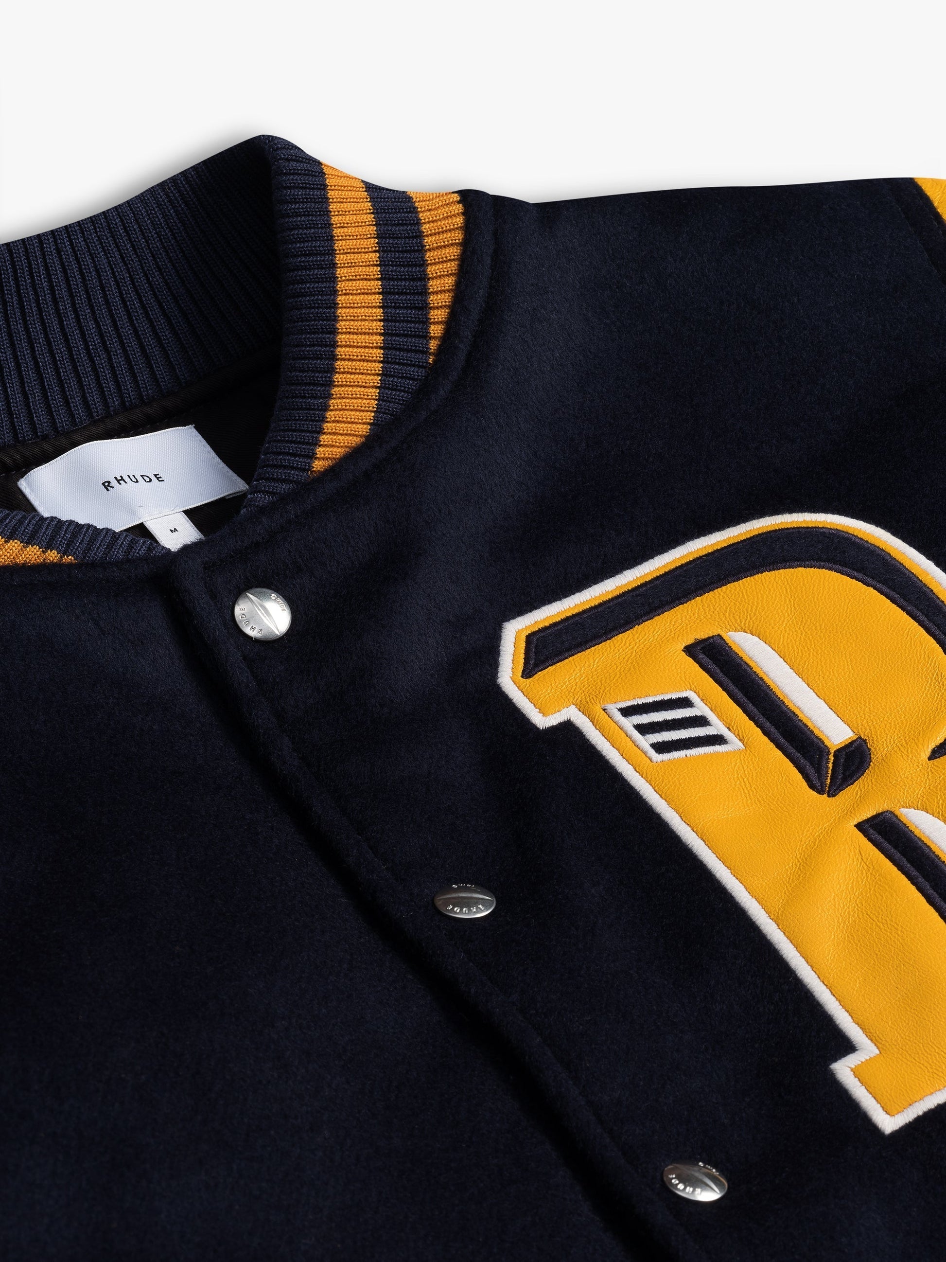 Crafted using the finest wool, the American Spirit Bomber Jacket boasts an "R" patch on the front and an American Spirit design on the back. Features two lightning bolt appliques on each shoulder, along with custom RHUDE snap closures and functional front pockets. With a ribbed collar, waist, and cuffs, this exceptional piece exudes style and quality.