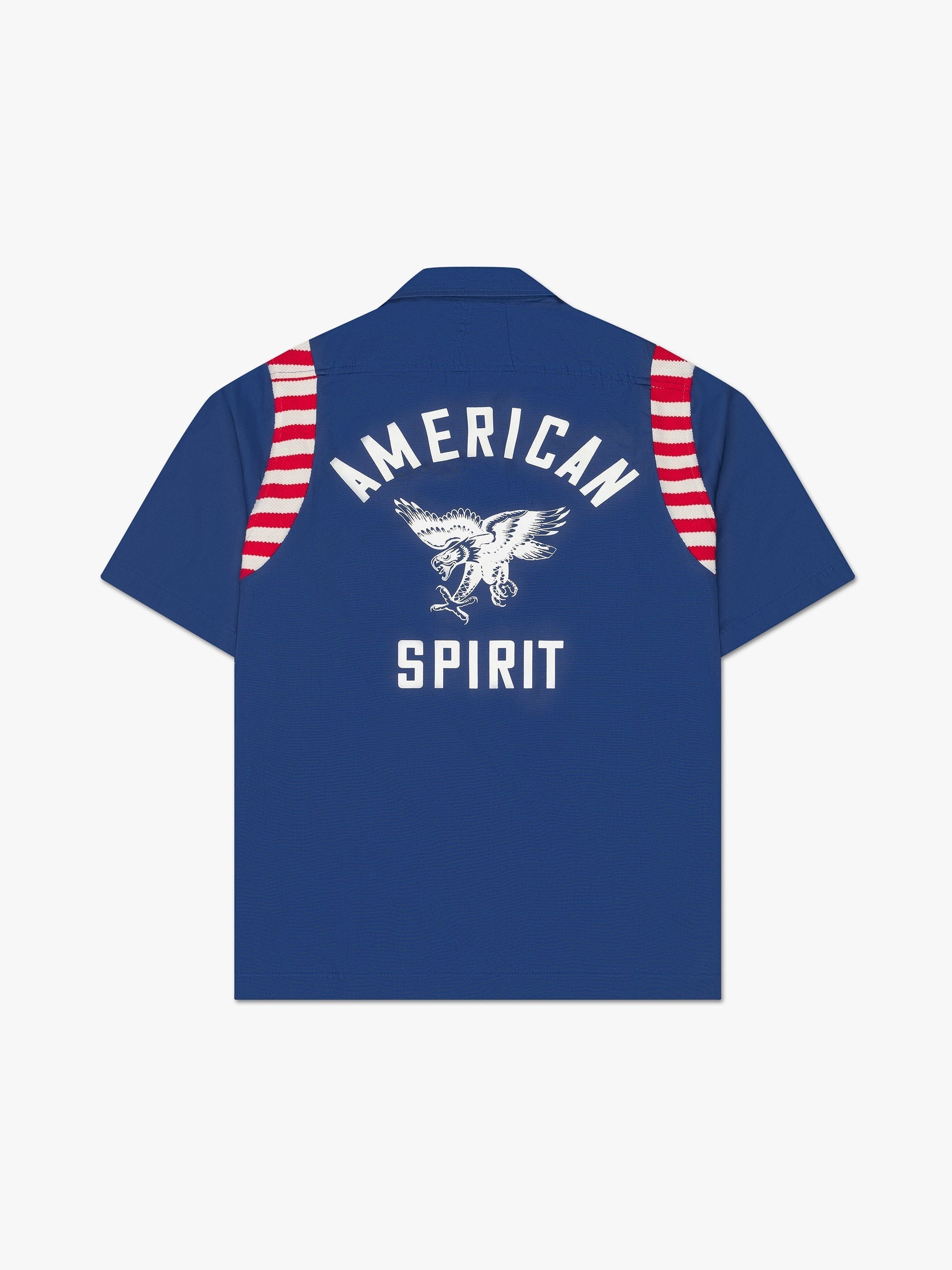 Timeless cotton button-up shirt, offering a relaxed and comfortable fit. Features a flat hem, custom front button closures, and a distinctive Rhude logo embroidered on the front, while the back showcases the Rhude American Spirit design.