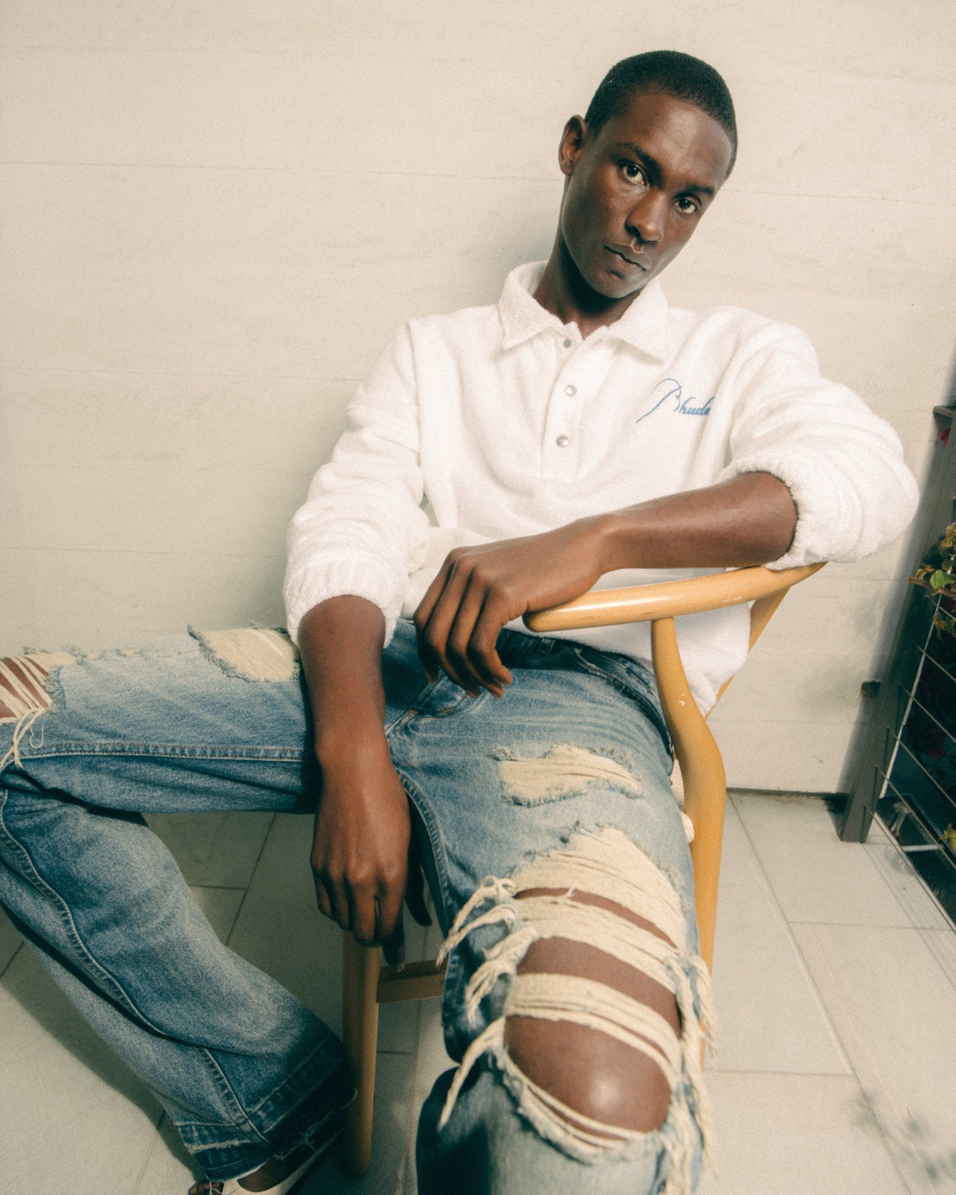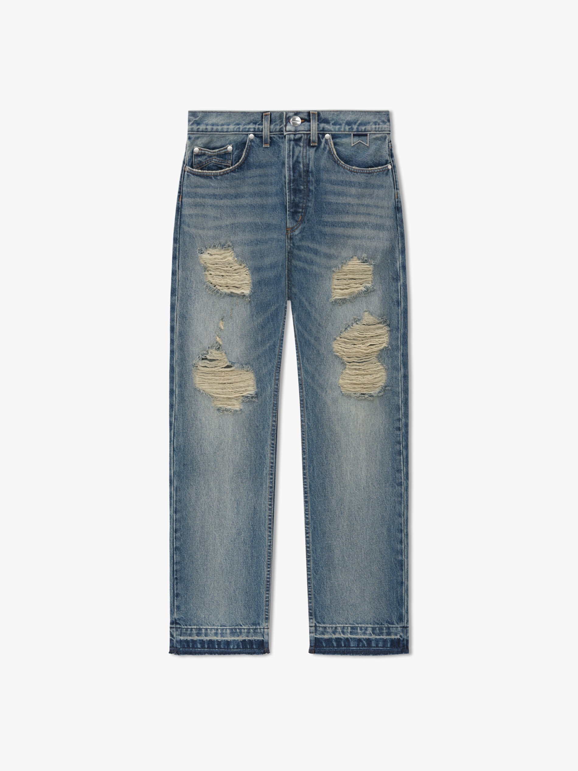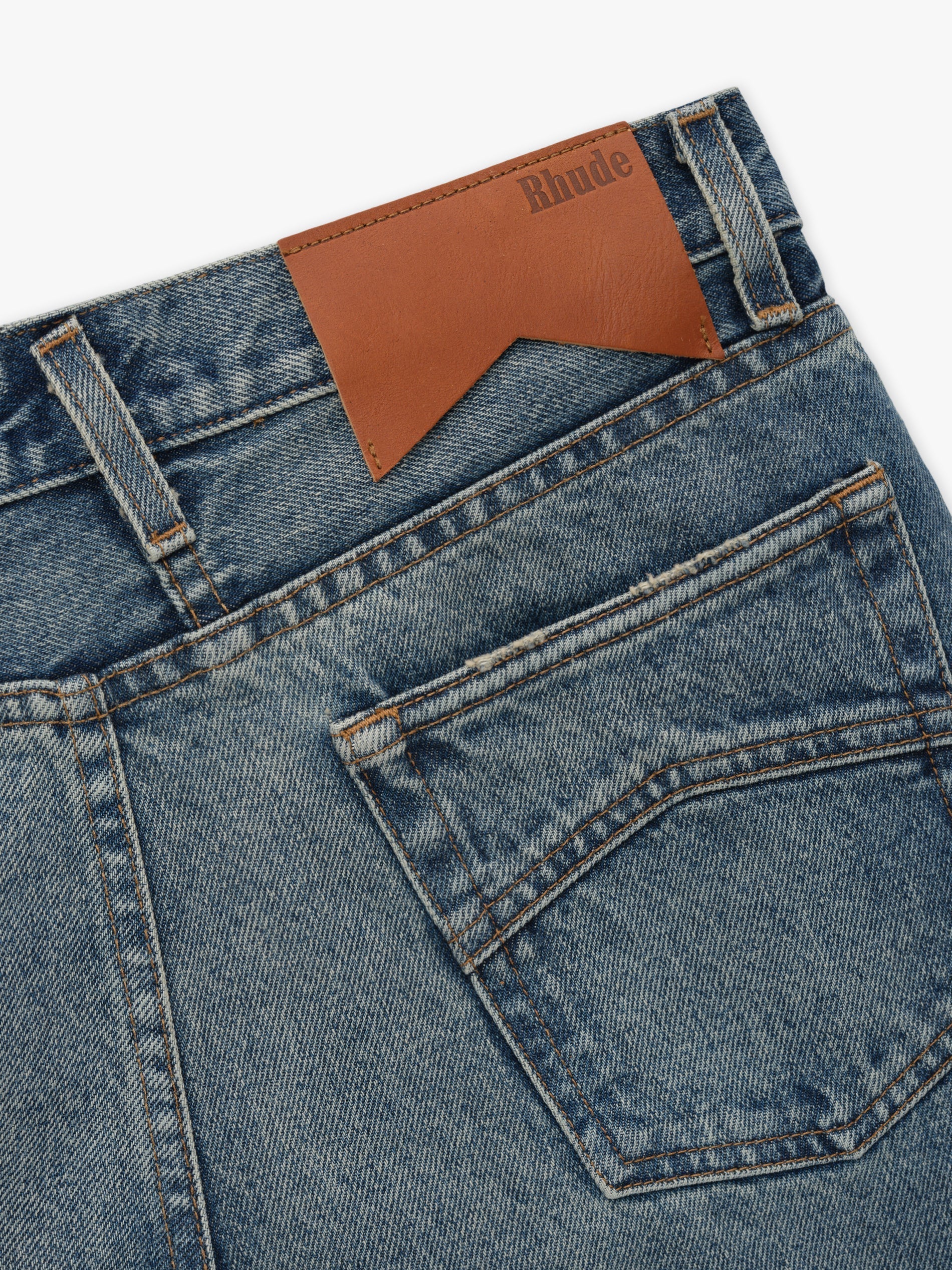 Premium cotton pant features a mid-rise and slightly flared design, offering a modern silhouette. The double knee offers a ripped construction. Adorned with custom RHUDE hardware. Featuring a zip fly with button closure, with two front pockets and two rear flap pockets. The distressed paint detailing on the front adds a unique touch. Adjustable cuffs with raw-cut details provide a personalized fit.
