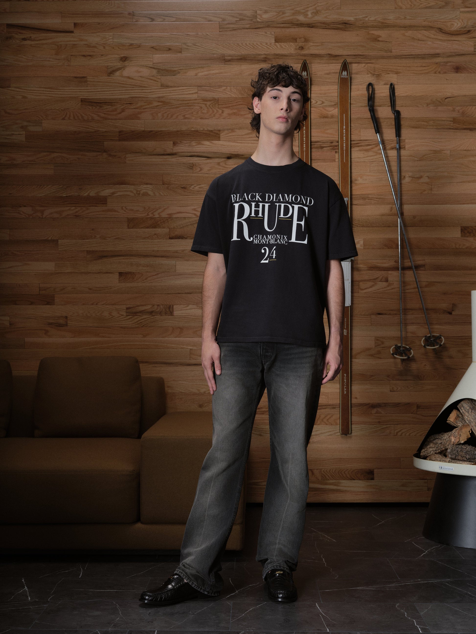 Custom-fit vintage wash cotton short sleeve tee-shirt with Rhude Black Diamond ski graphics printed at front.