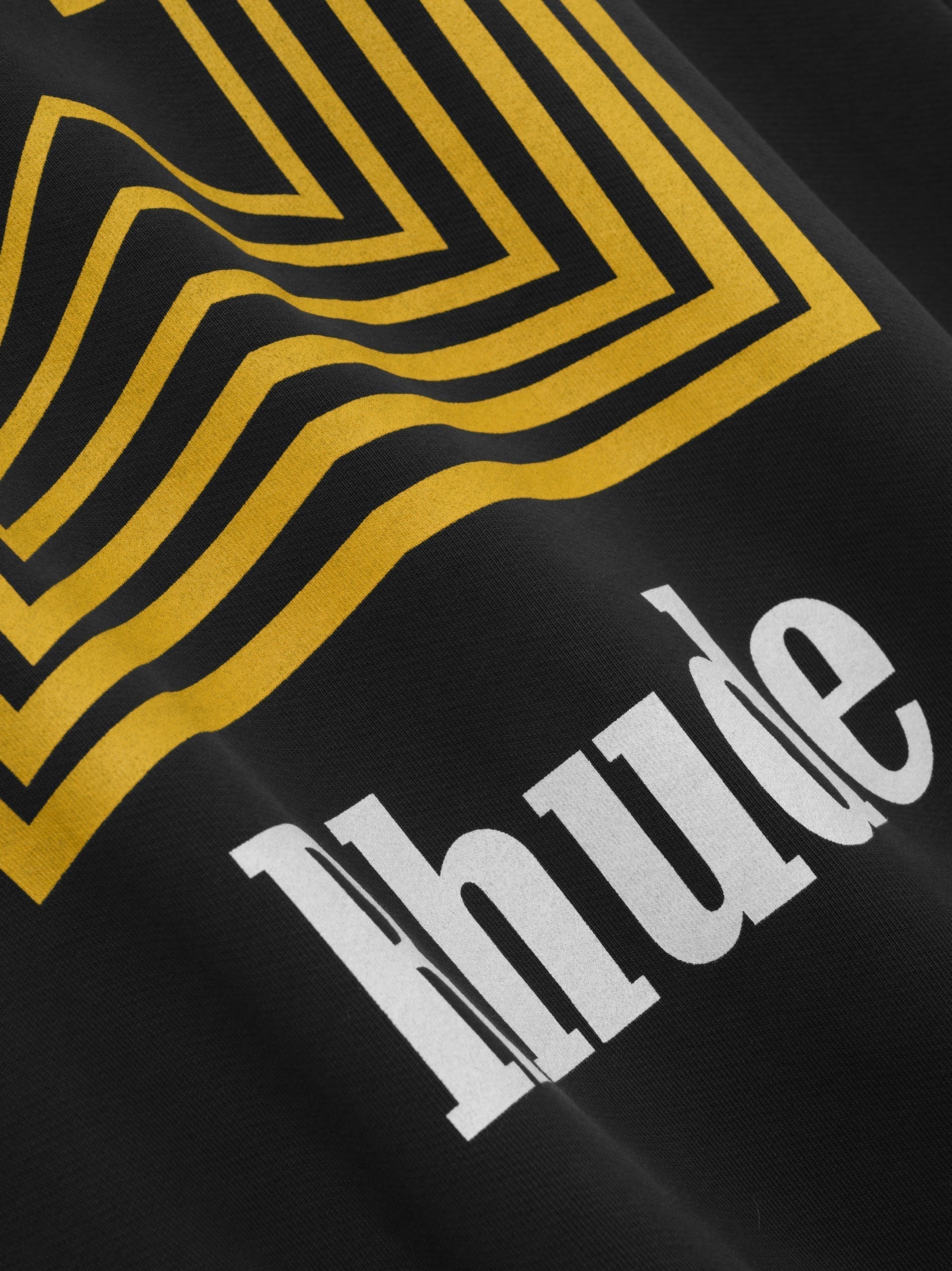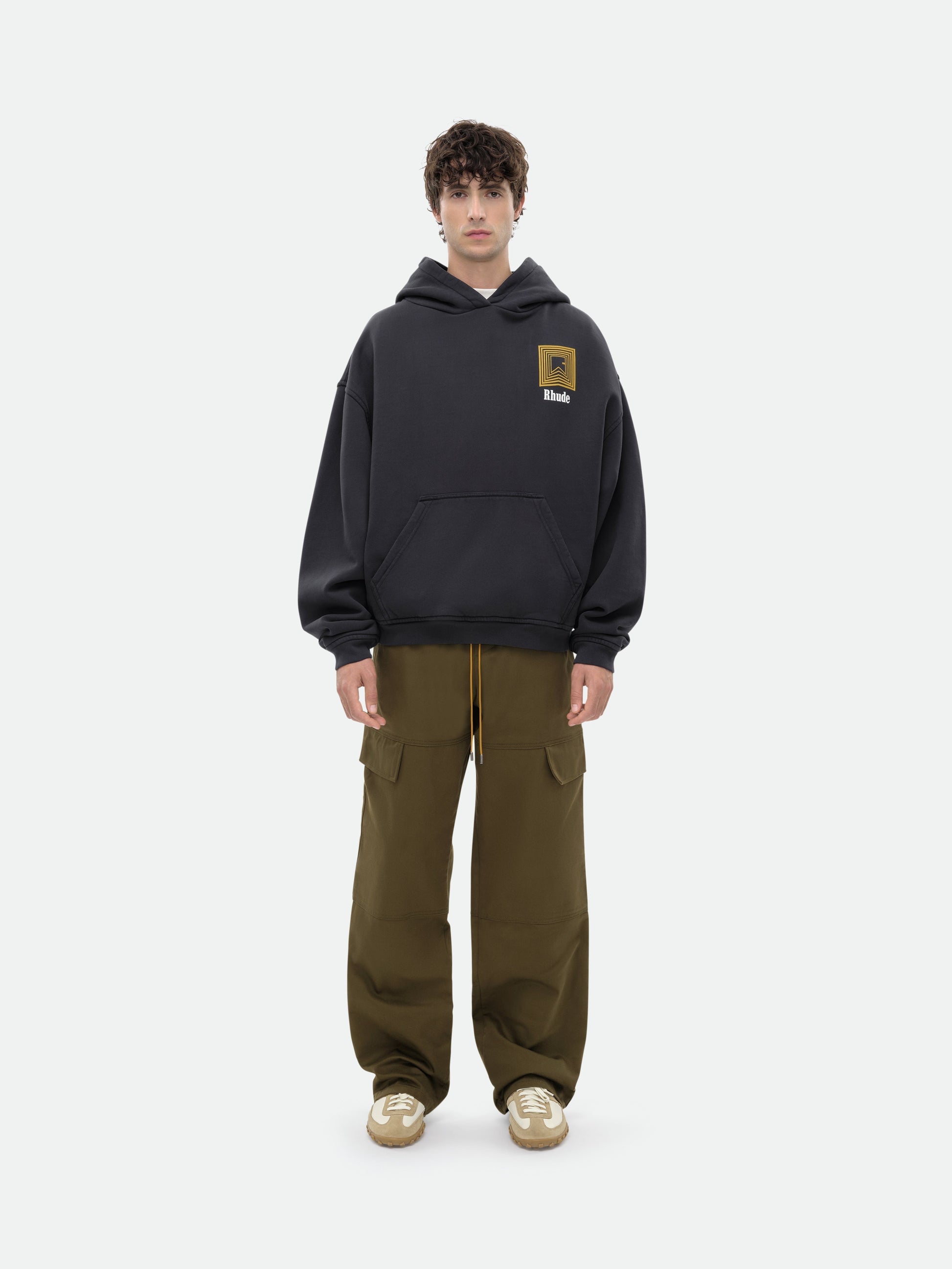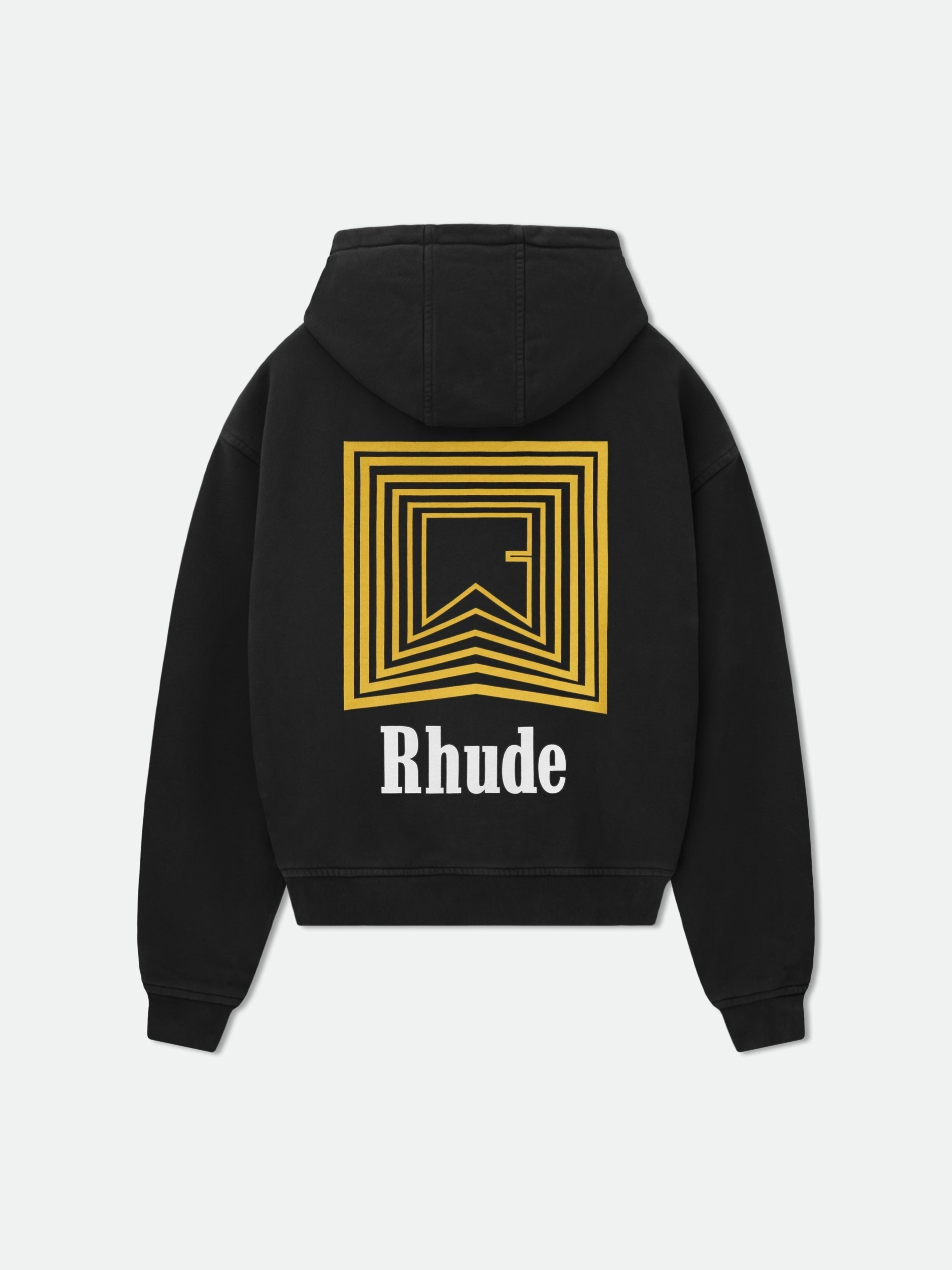 Long sleeve French Terry hoodie with Rhude Chevron Box logo graphics printed on the front chest and back. Featuring a kangaroo front pocket and dropped shoulders. Each piece is unique and print distressing my vary per style.
