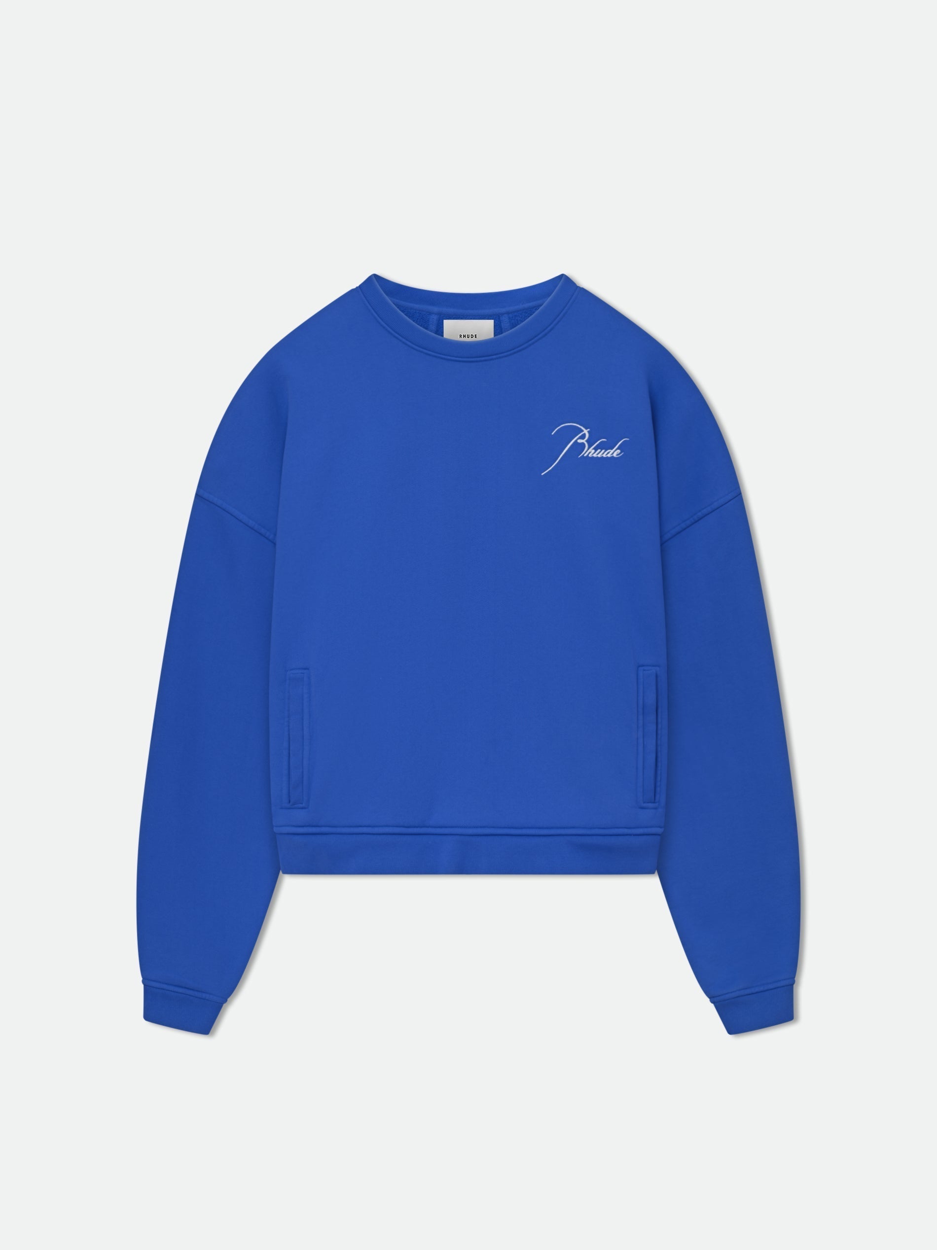 Long sleeve French Terry crew with Rhude signature logo embroidered on the front and back. Featuring a kangaroo front pocket and dropped shoulders.