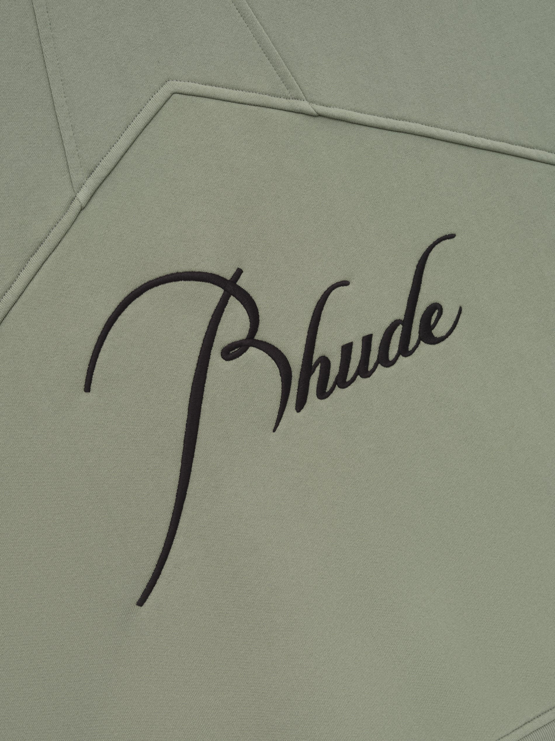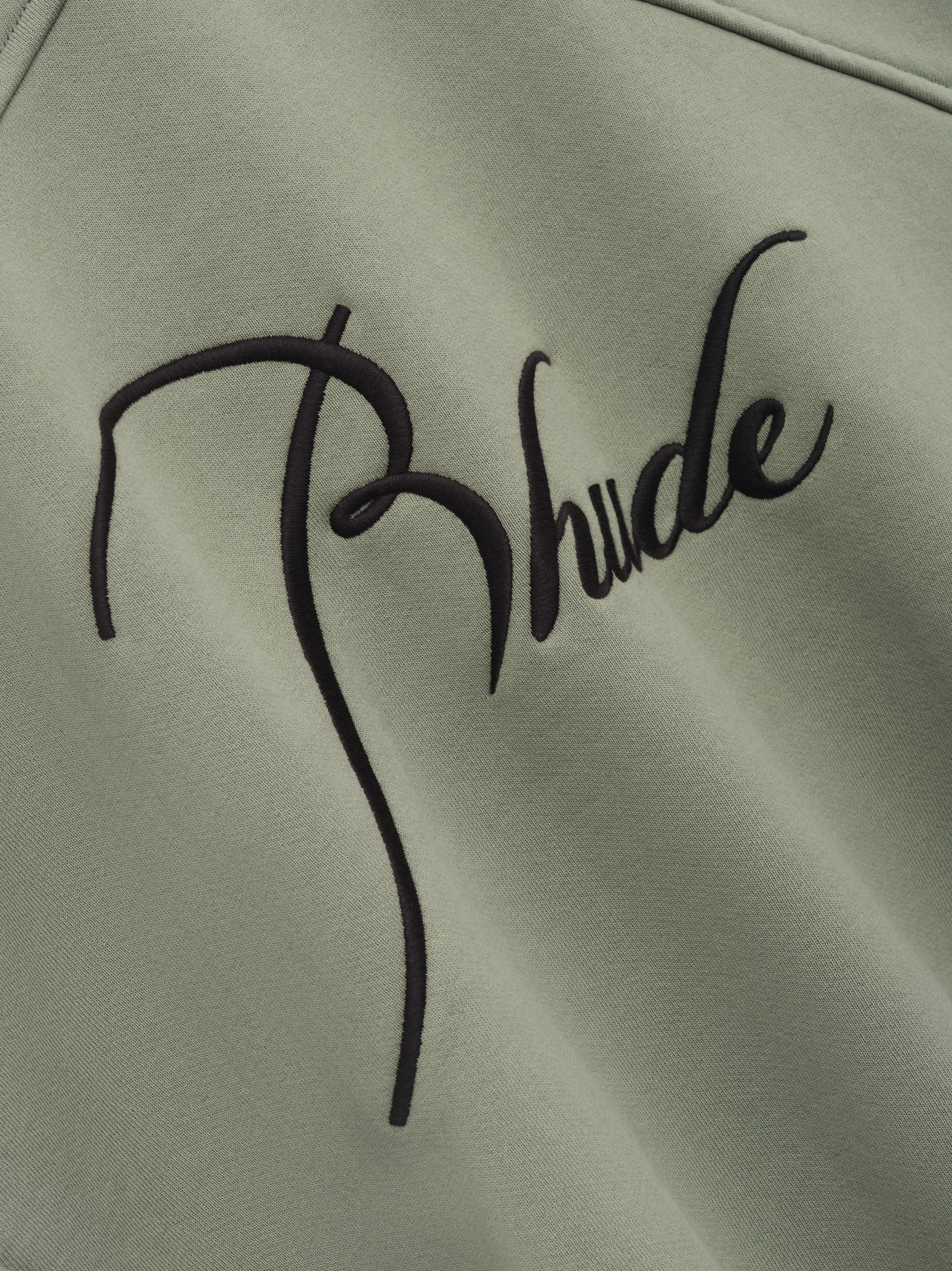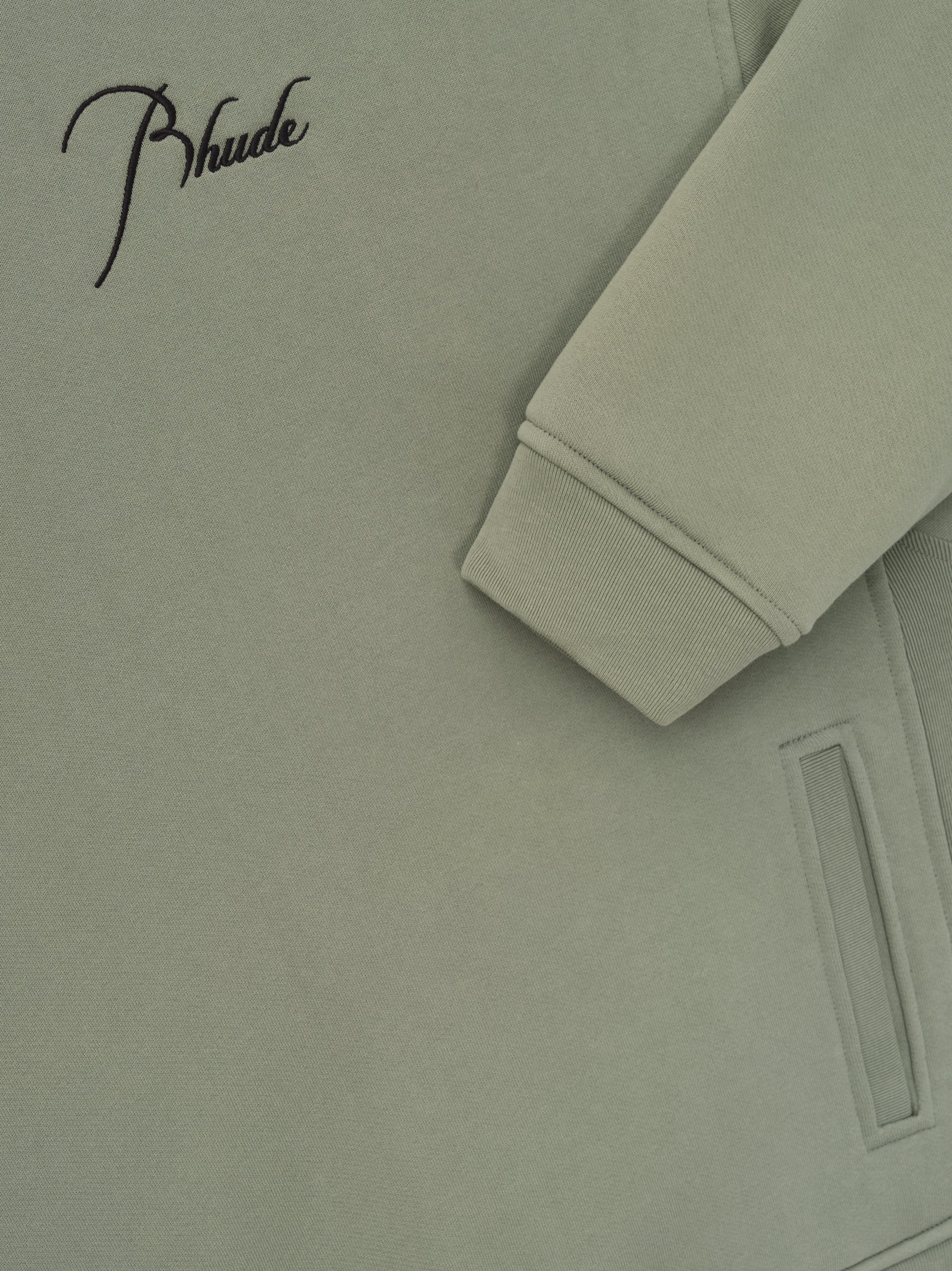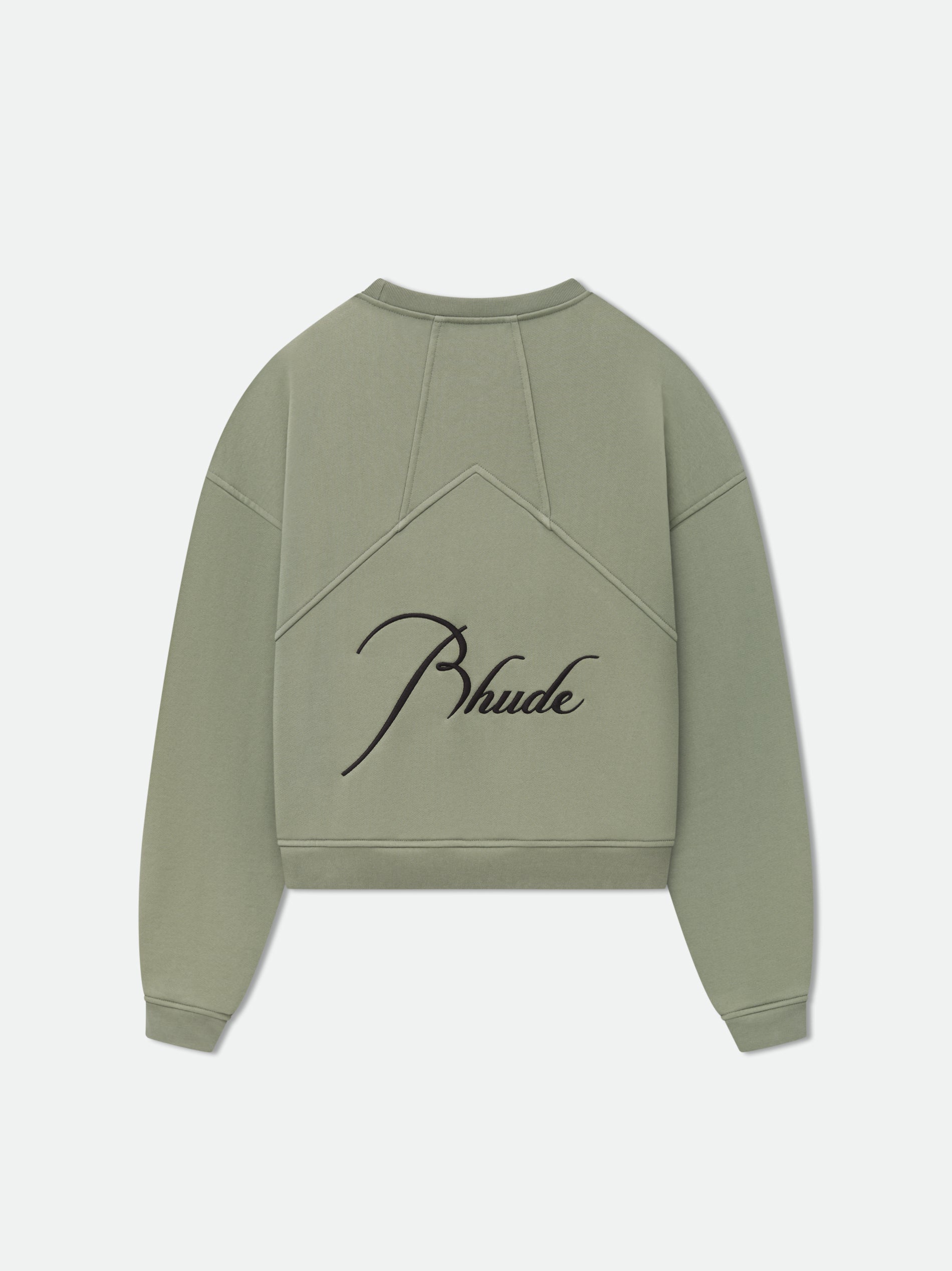 Long sleeve French Terry Crewneck with Rhude signature script logo embroidered on the front and back. Featuring a kangaroo front pocket and dropped shoulders.