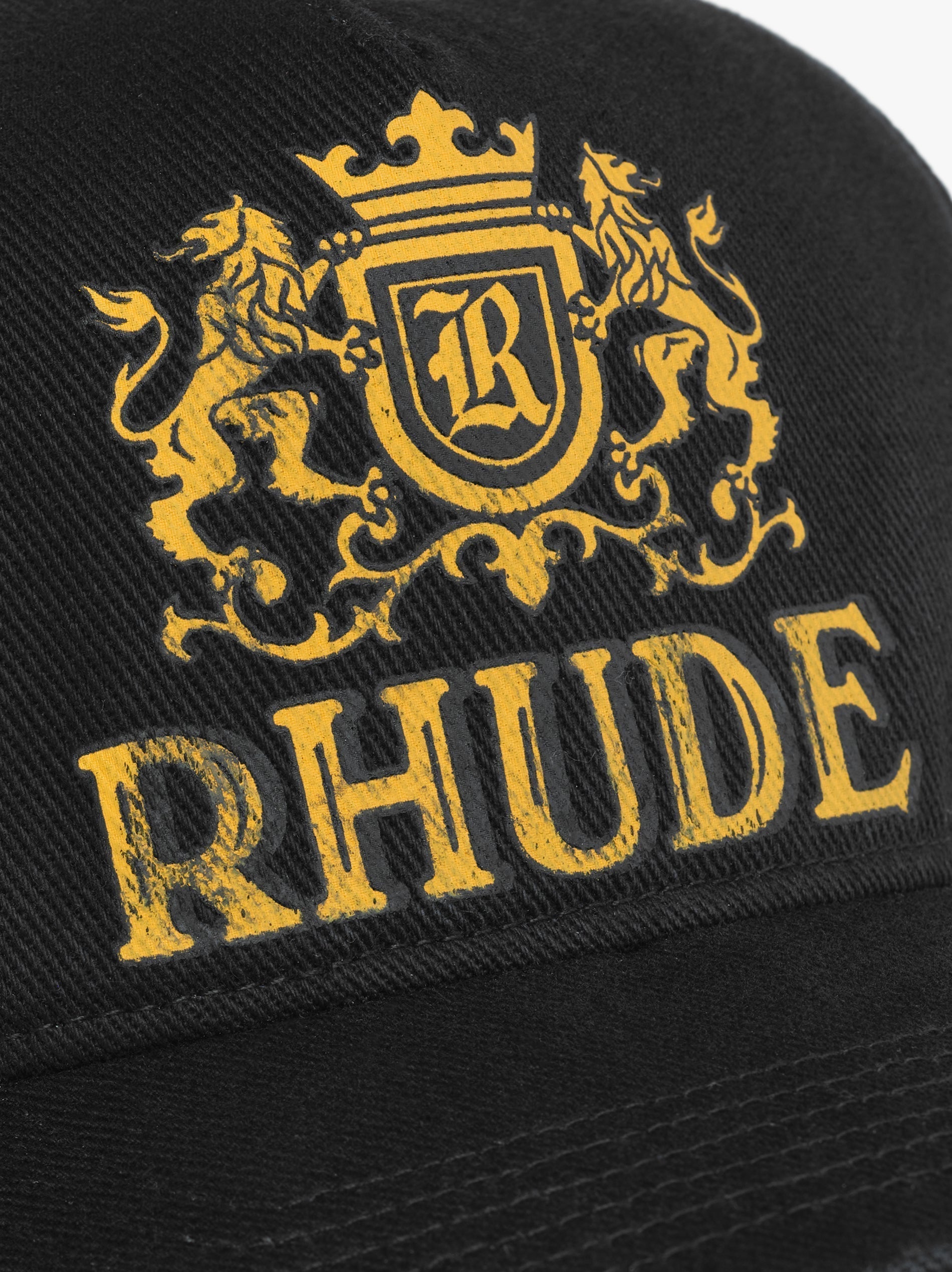 Heavyweight poly/cotton blend hat with "RHUDE" cresta cigar inspired designs printed on the front. Features an adjustable strap at the back with custom chevron hardware, so you can adjust the fit to your preference.