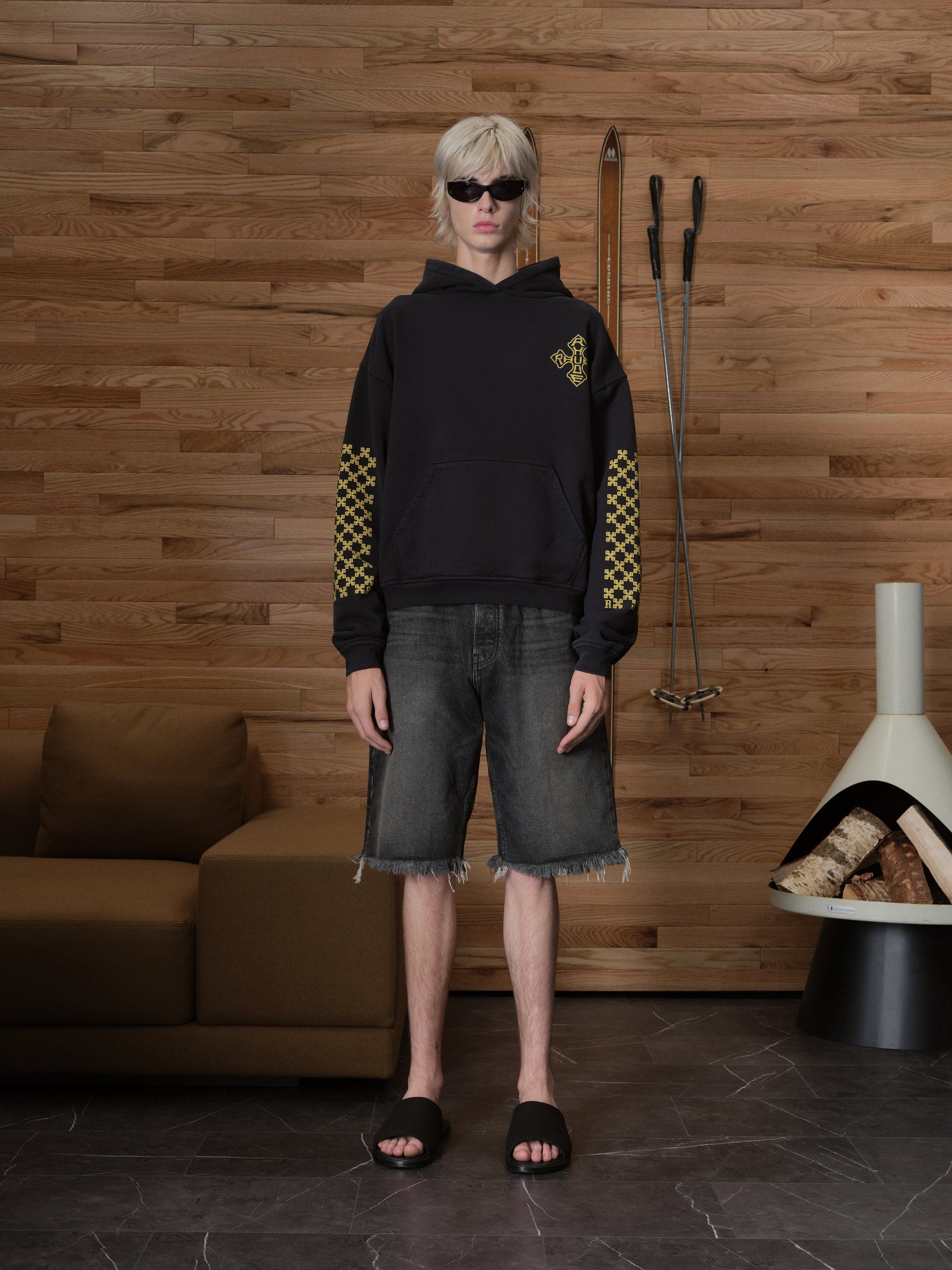 Long sleeve French Terry hoodie with monogram pattern down the arms, and Rhude cross graphic printed at chest and back. Featuring a kangaroo front pocket and dropped shoulders. Each piece is unique and distressing my vary per style.