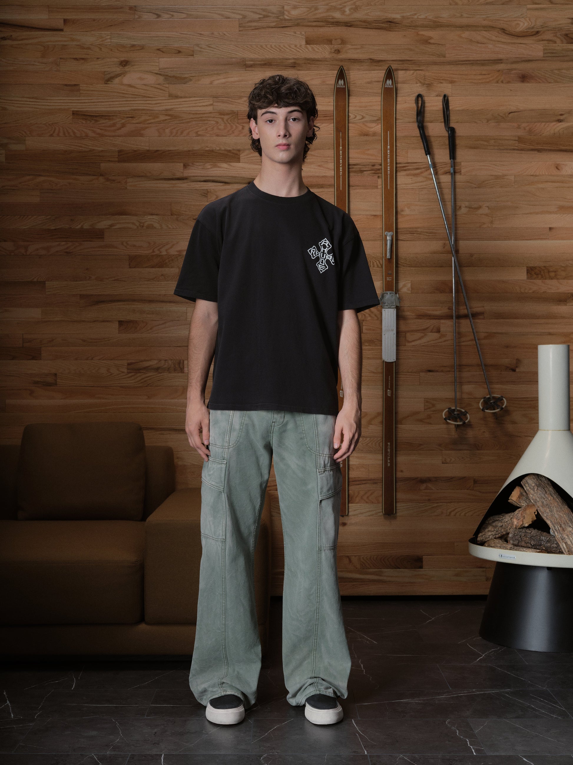 Custom-vintage fit cotton tee shirt with a ribbed neckline and short sleeves. Features RHUDE Cross designs printed on front chest and back.