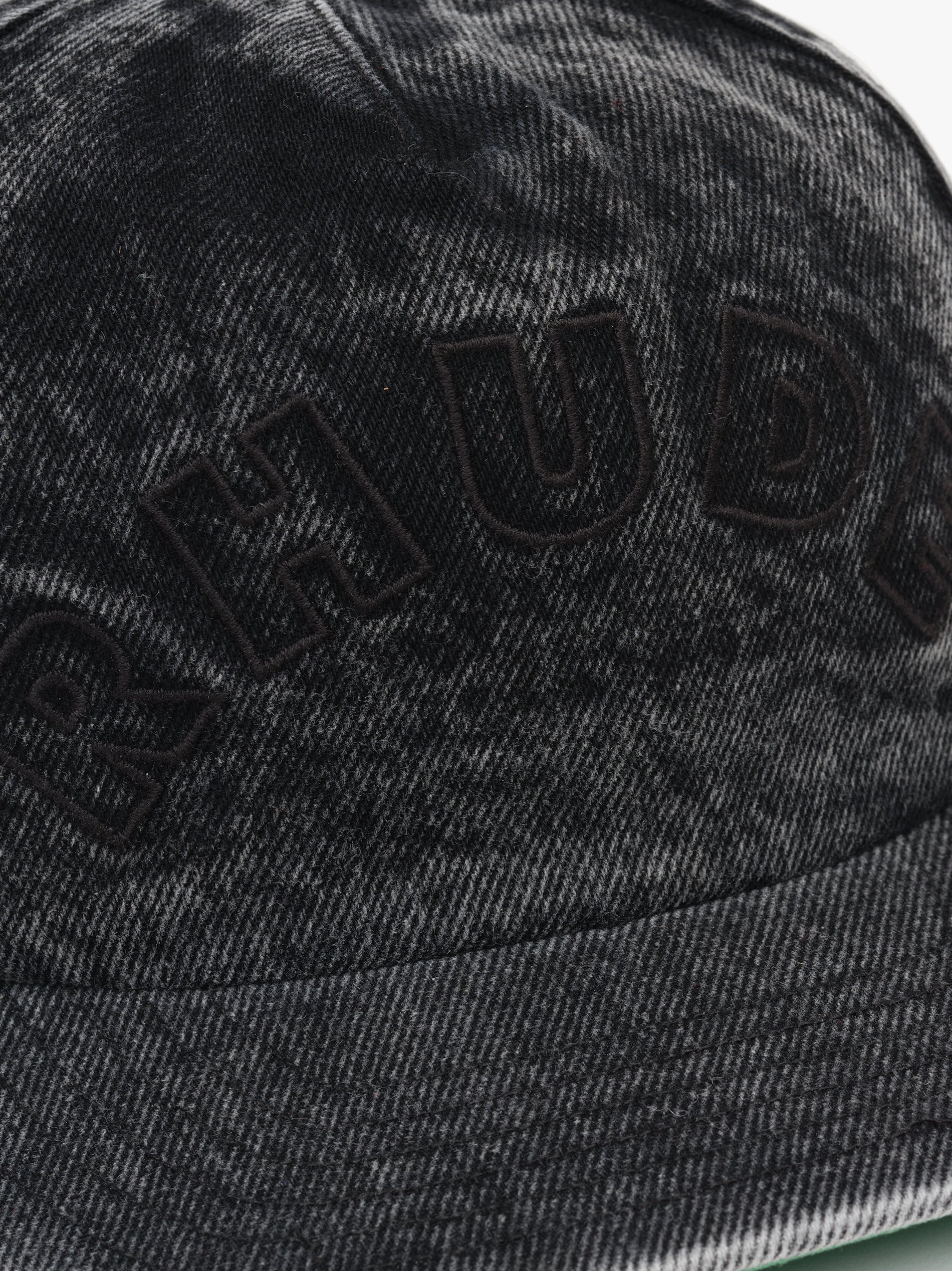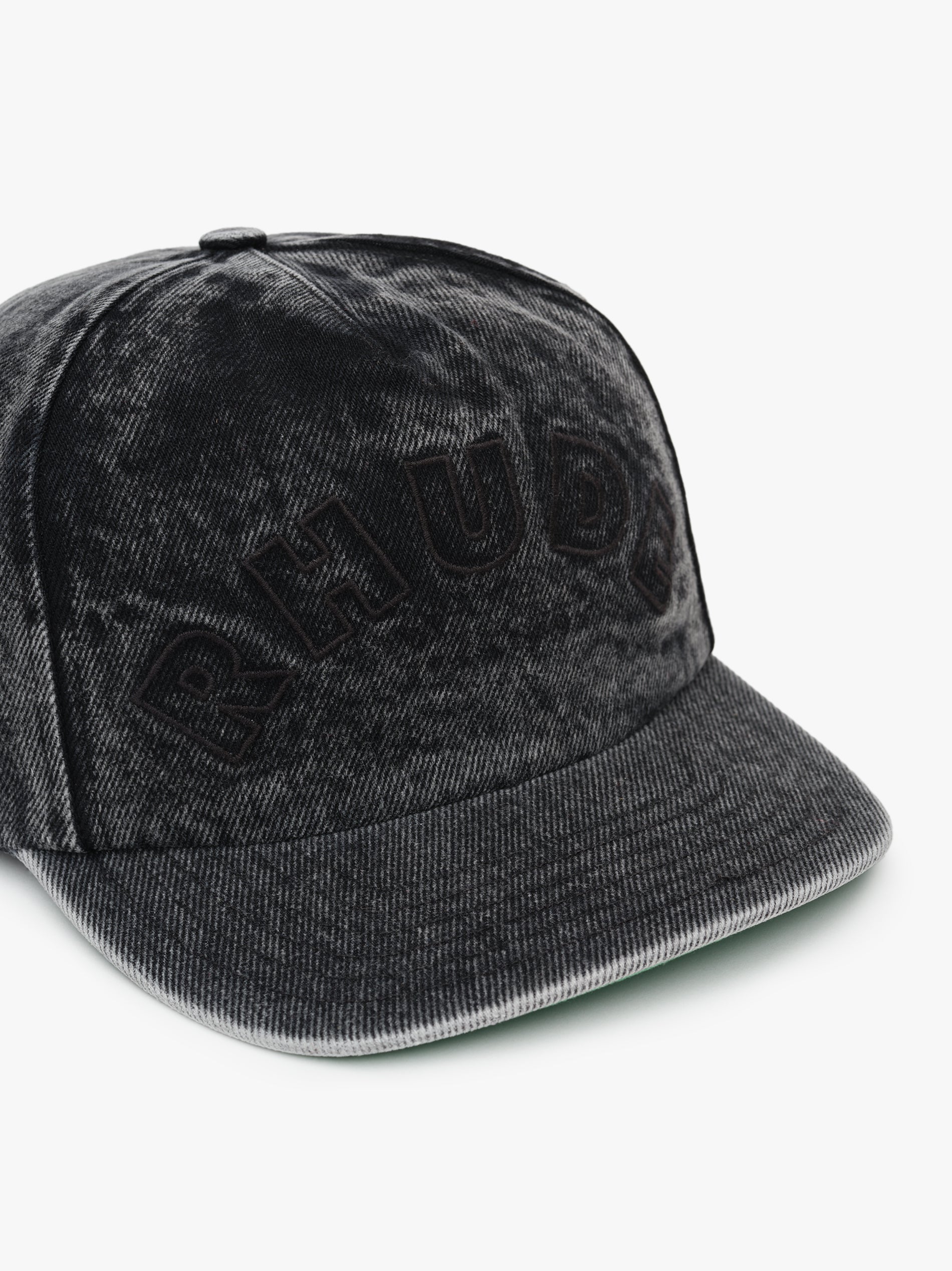 Heavyweight cotton denim hat with "RHUDE" logo embroidered on the front. Features an adjustable strap at the back, so you can adjust the fit to your preference, and green under brim.