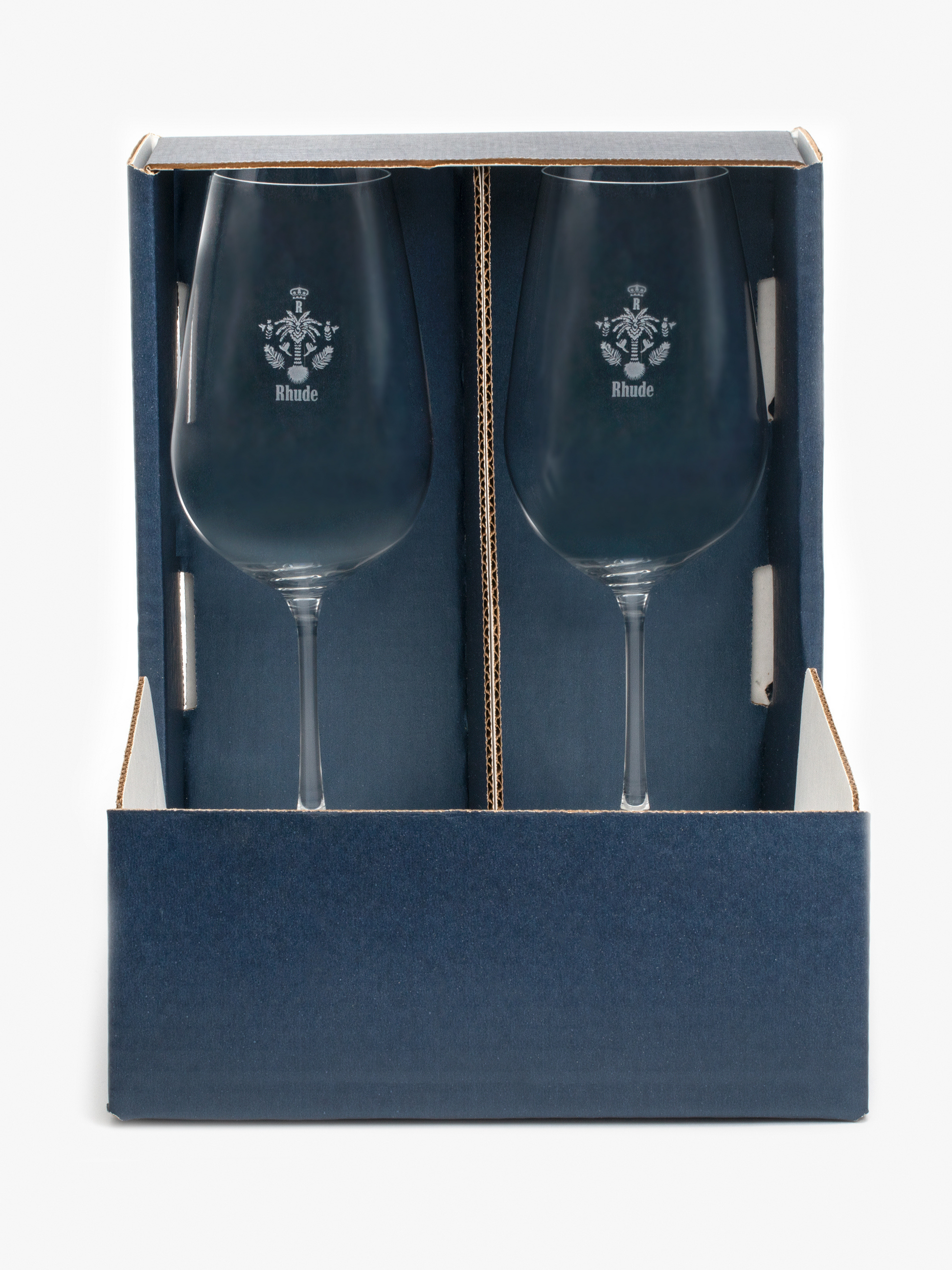 Set of Two Wine Glasses. Admire the artistry and precision in every sip as you see the iconic Rhude logo and crest etched onto each glass. This set is for those who appreciate style and luxury, making it a must-have for any wine enthusiast's collection.