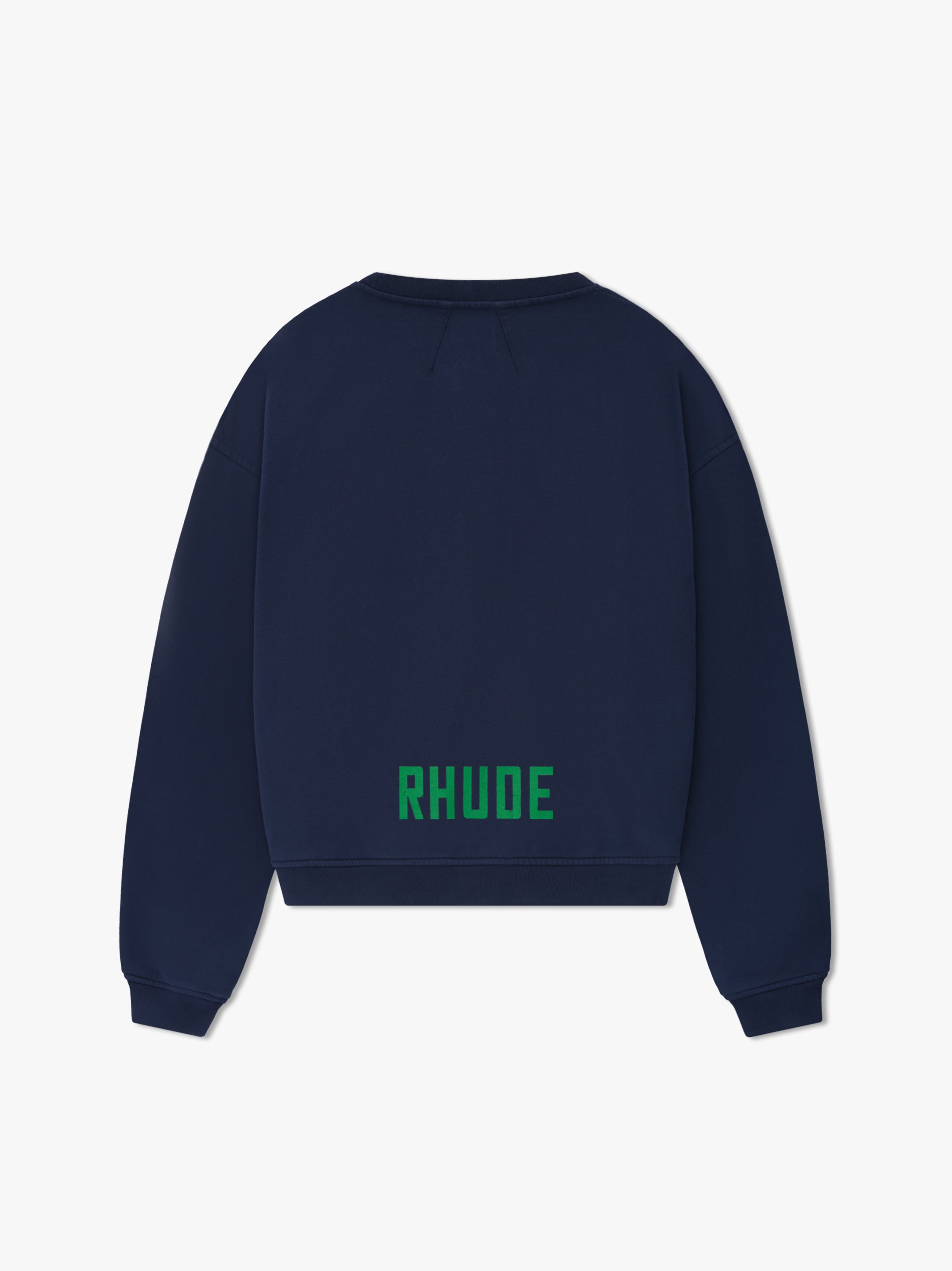 Long sleeve french terry crewneck with Rhude "Hampton Regatta" designs printed on the front with Rhude logo on back, with dropped shoulders.