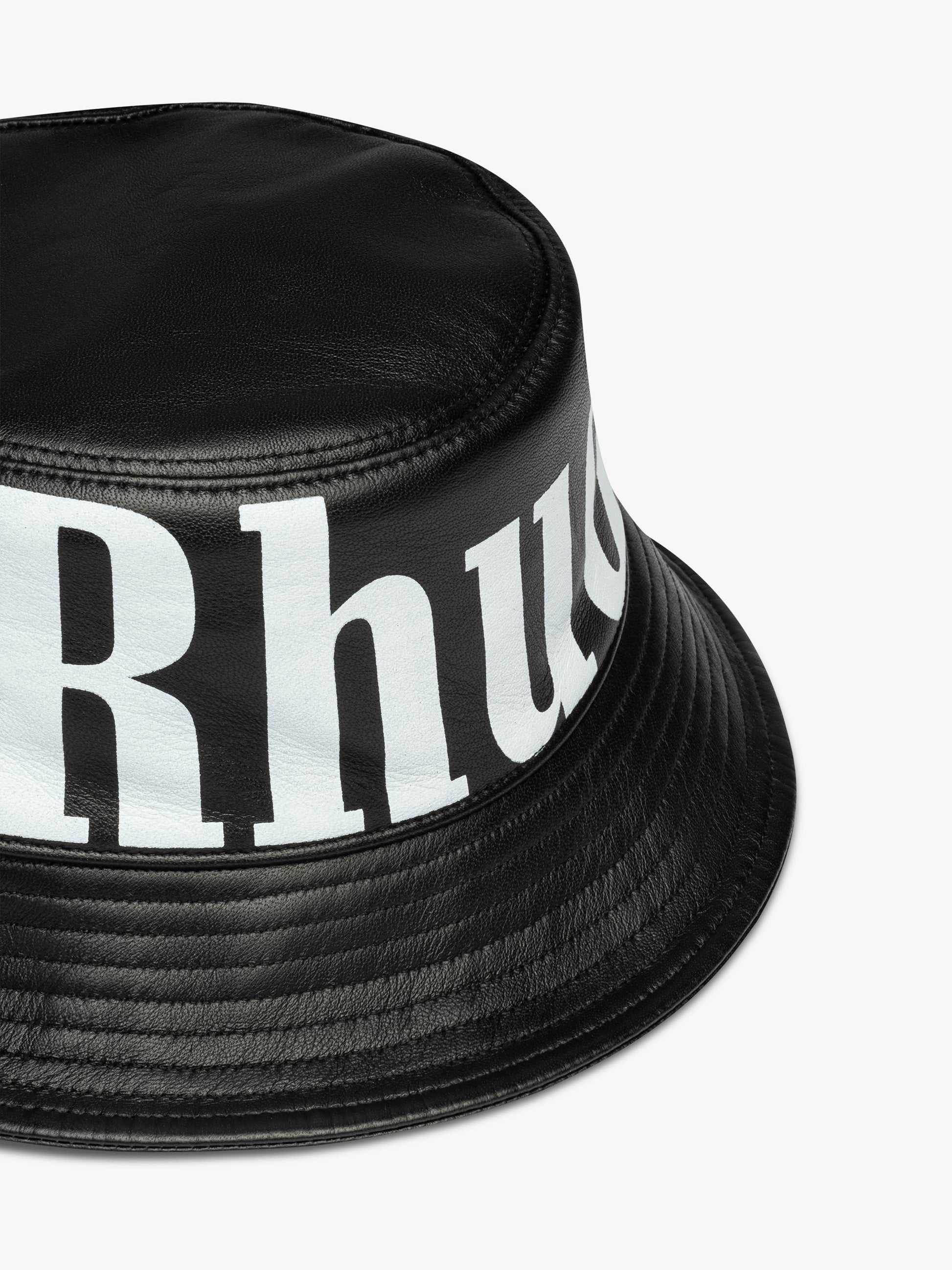 Our premium leather bucket hat is a stylish and practical accessory featured in black with white RHUDE logo.
