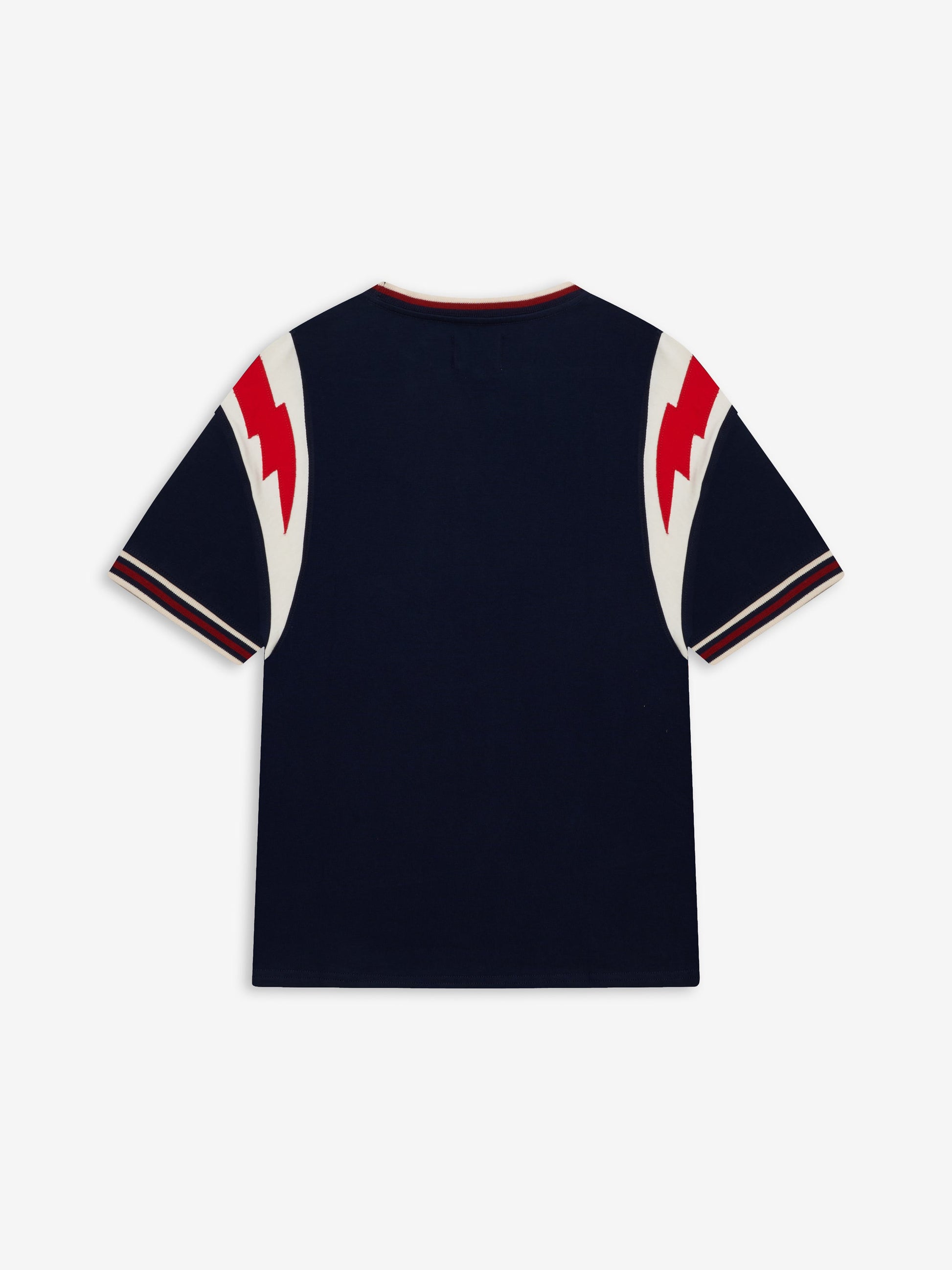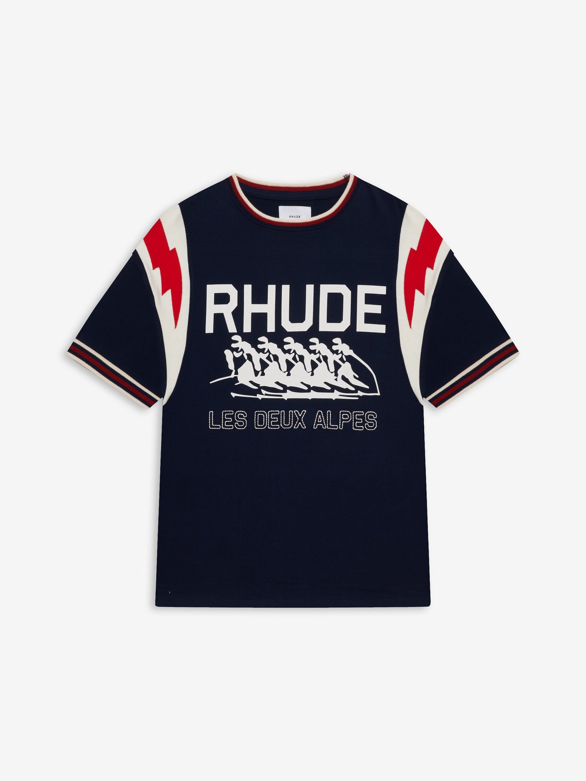 Premium tee crafted from soft, lightweight fabric. Rhude Lightning Ringer jersey graphic showcased on the front. Features a comfortable and relaxed custom Rhude fit. The lightning design on the shoulders adds a sporty touch to this classic short sleeve.
