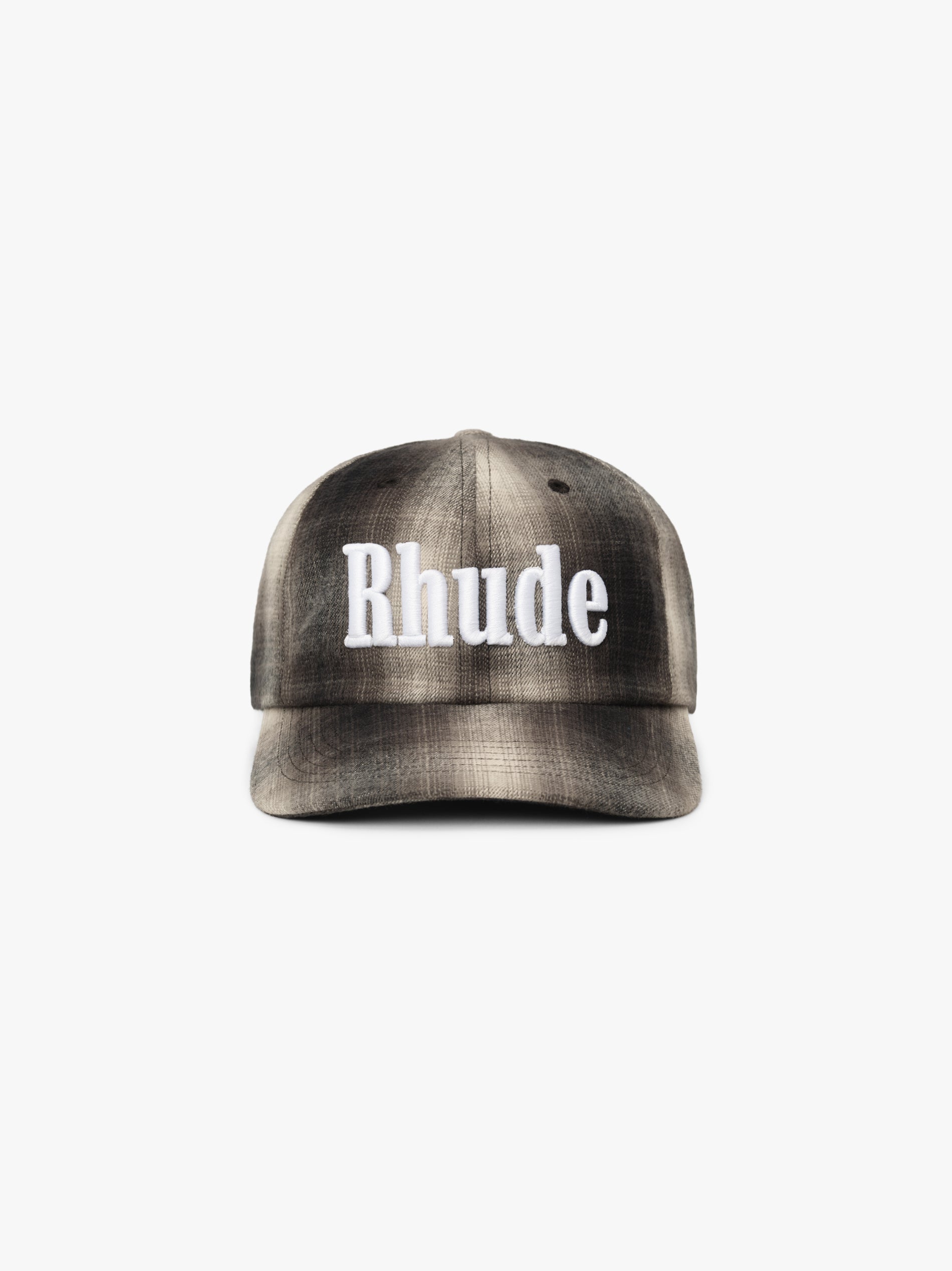 Unconstructed hat crafted from soft, flexible flannel material, features RHUDE logo on front, with green under the brim. Features an adjustable strap at the back, so you can adjust the fit to your preference.