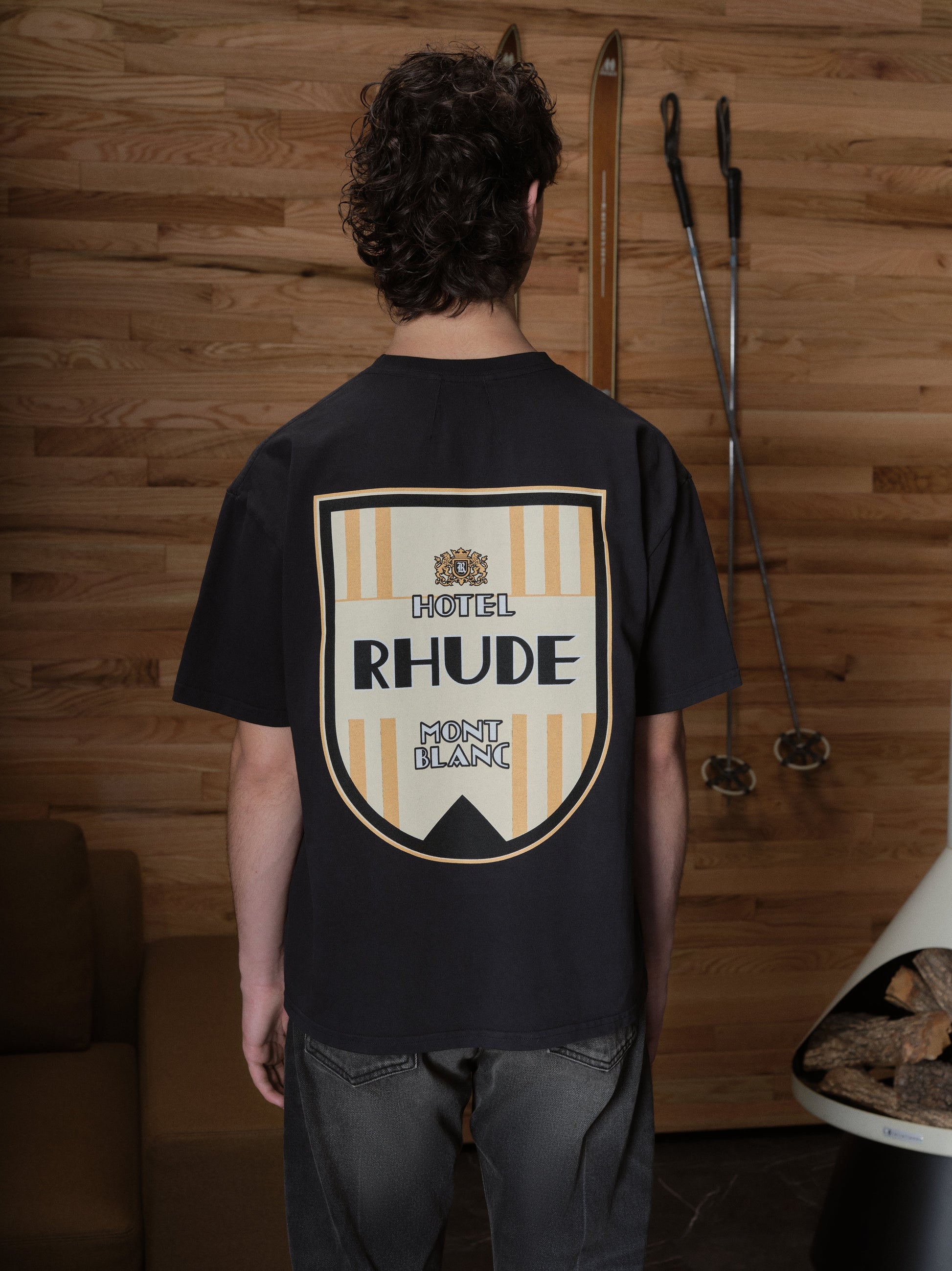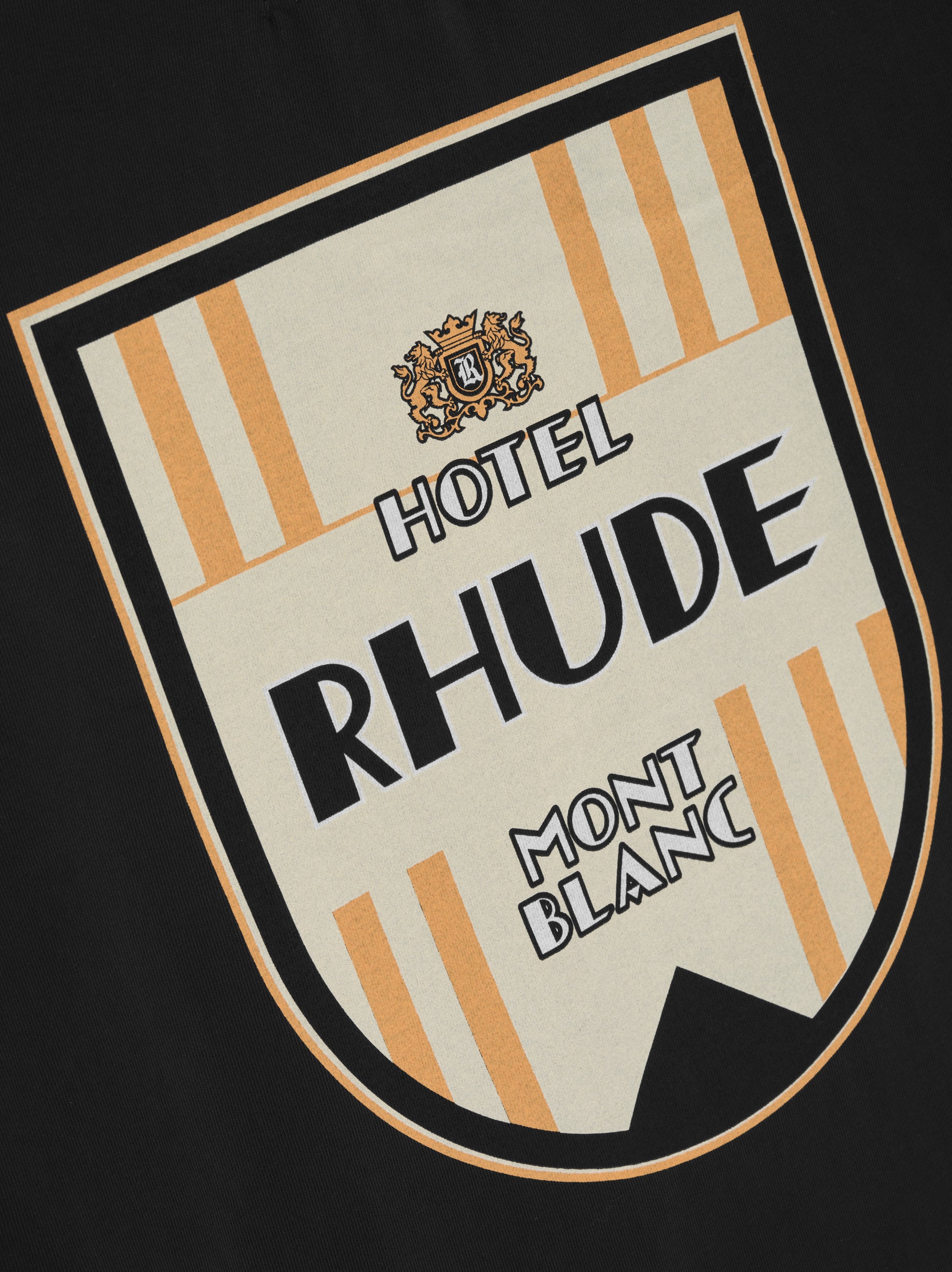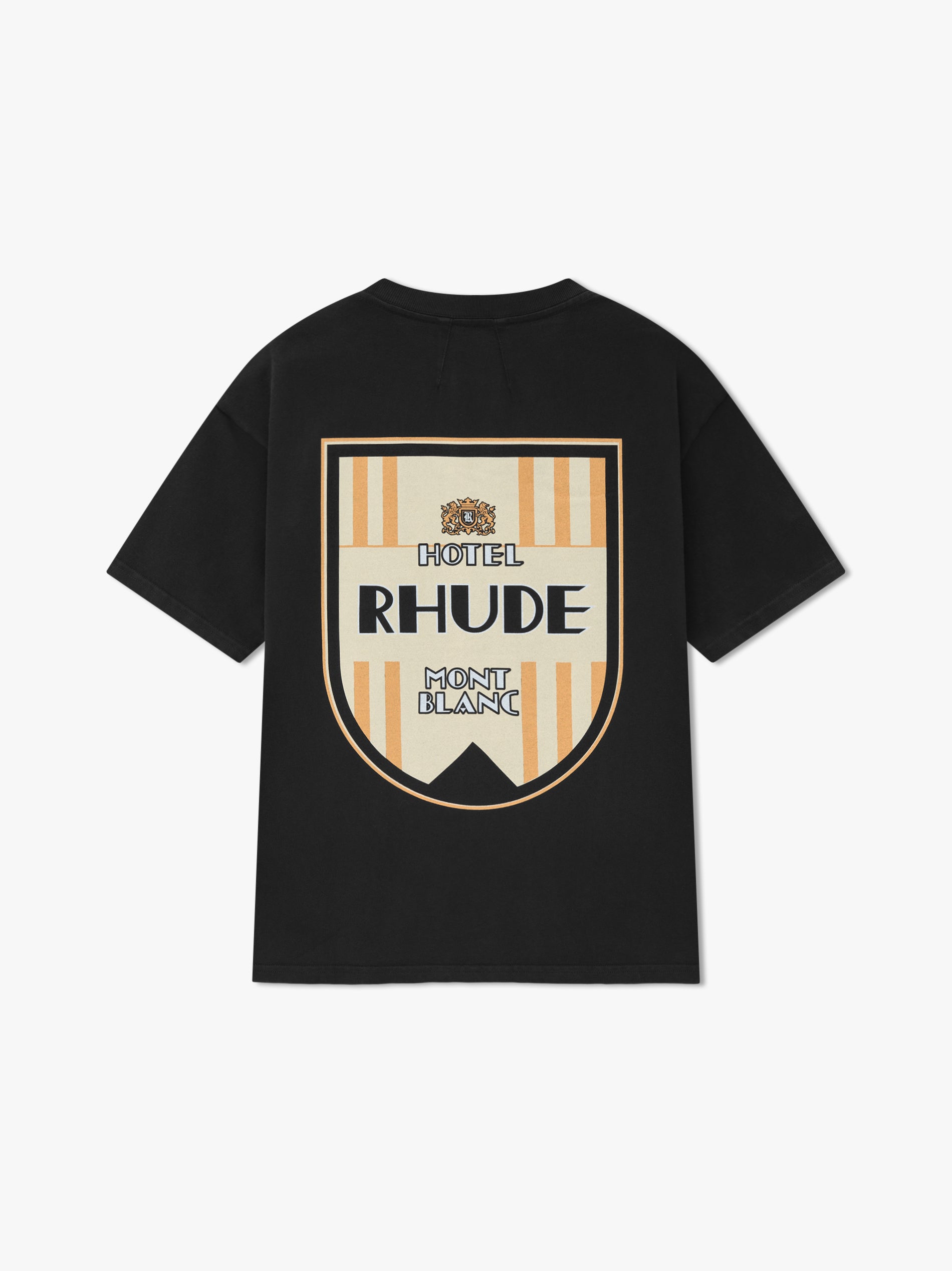 Custom-vintage fit cotton tee shirt with a ribbed neckline and short sleeves. Features RHUDE Mont-Blanc Hotel designs printed on front chest and back.