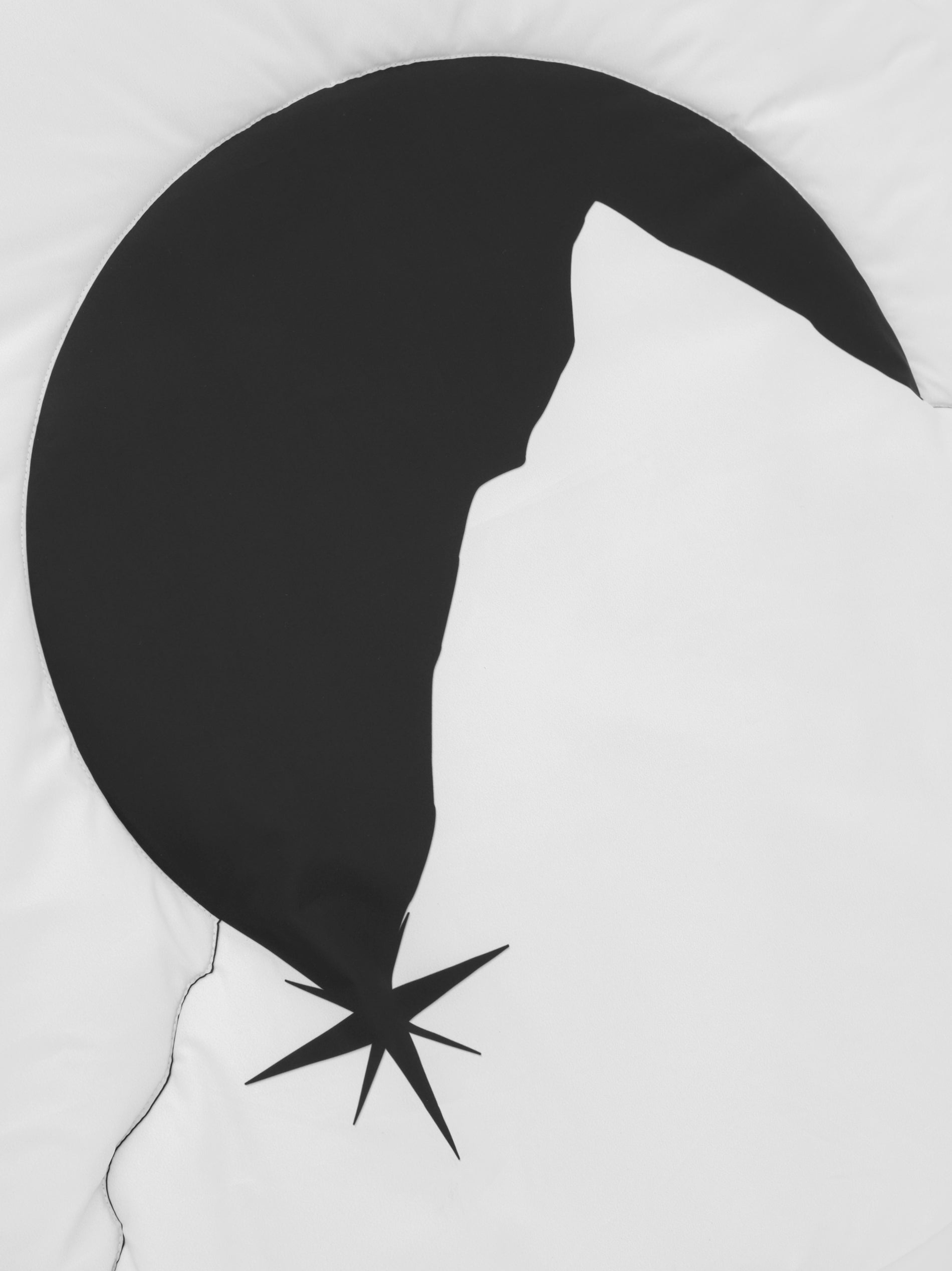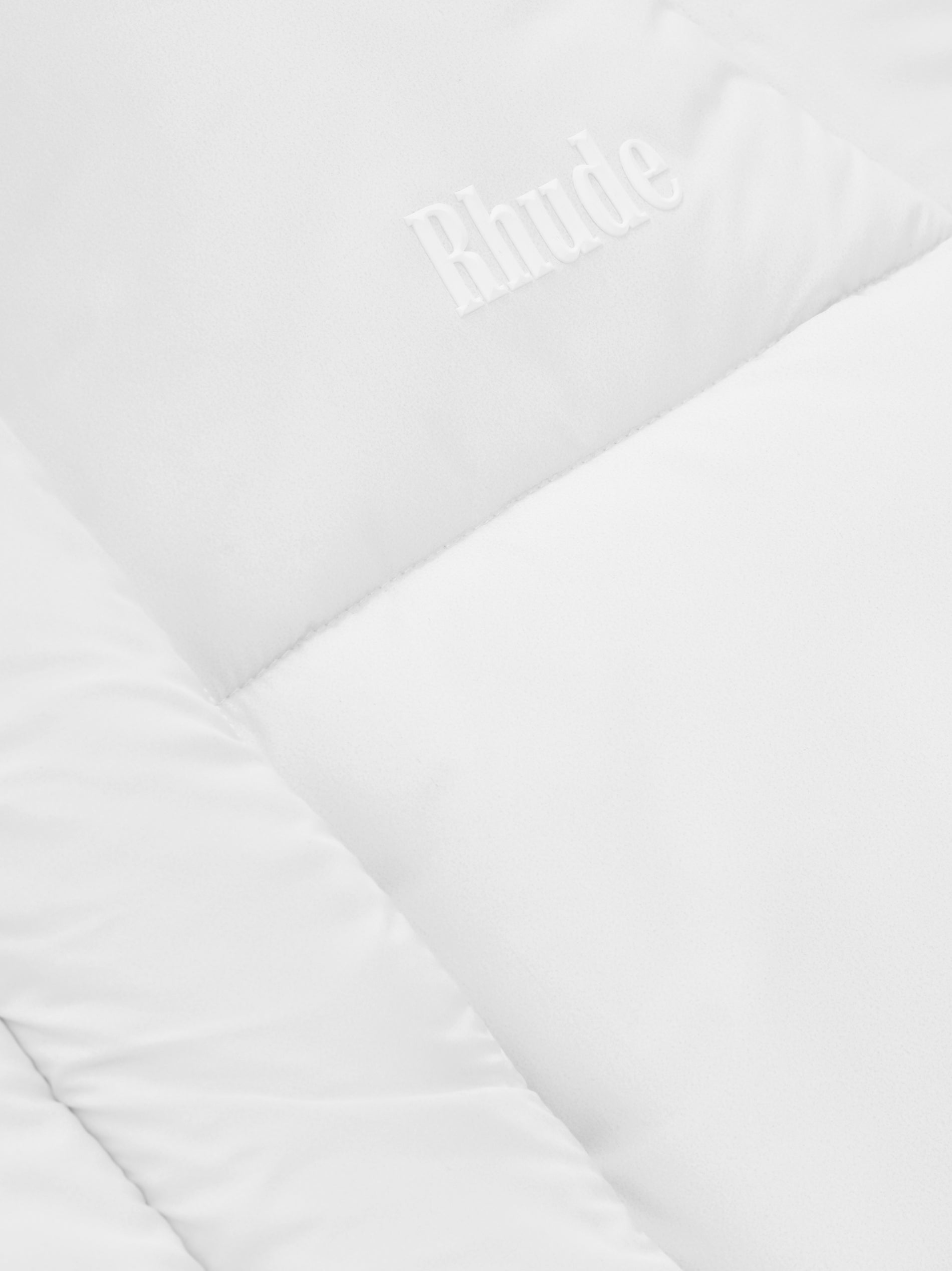Premium quilted puffer jacket with moonlight design on the back and a detachable hood. Twin pockets at front. Two-way zipper closure with custom Rhude Pill hardware, featuring ribbed waist and cuffs.