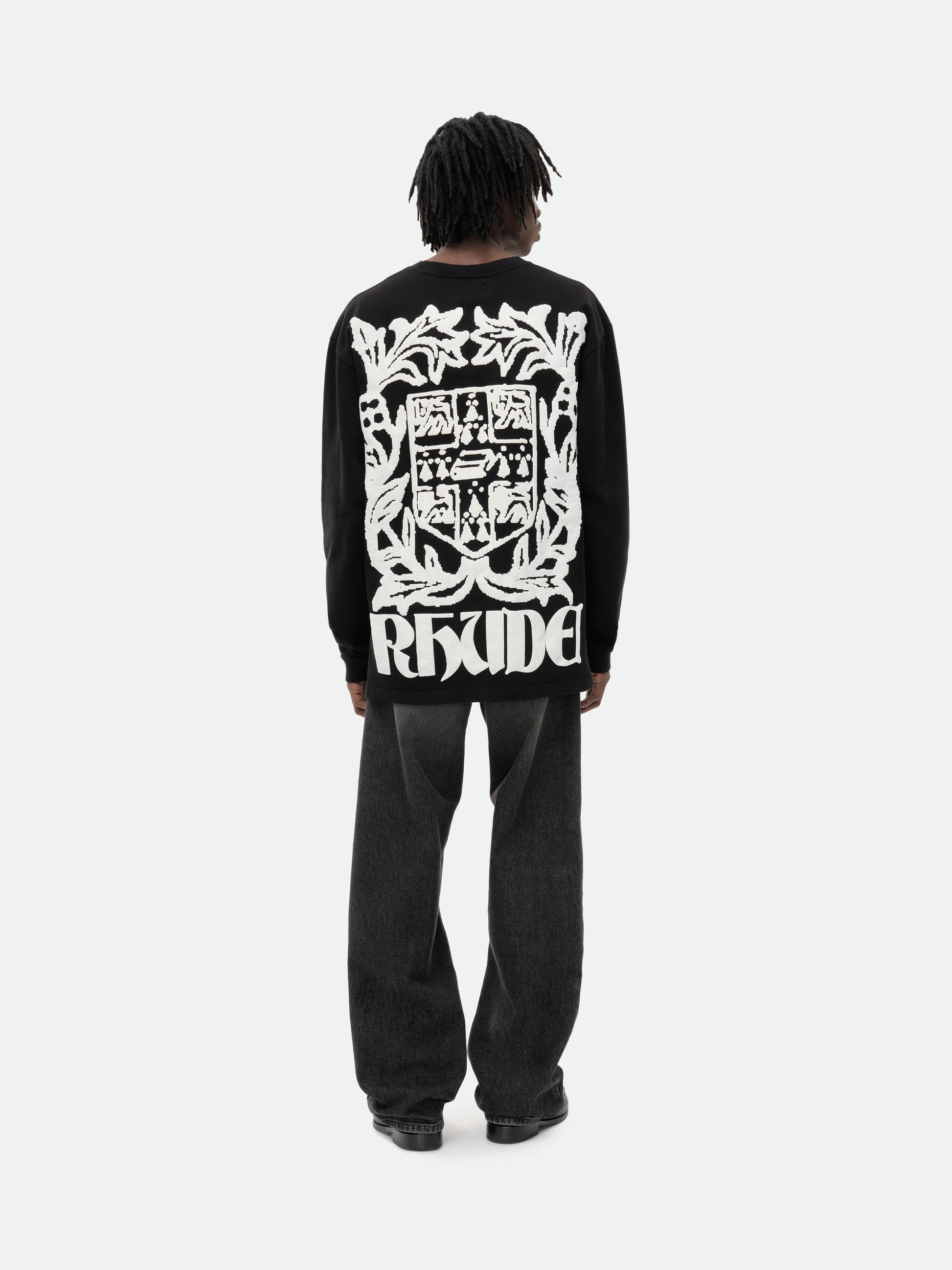 Premium long sleeve tee crafted from soft, lightweight fabric. Features a comfortable and relaxed custom Rhude fit. Ribbed neck and sleeves, with Rhude Crest graphics on front and back in custom puff print.