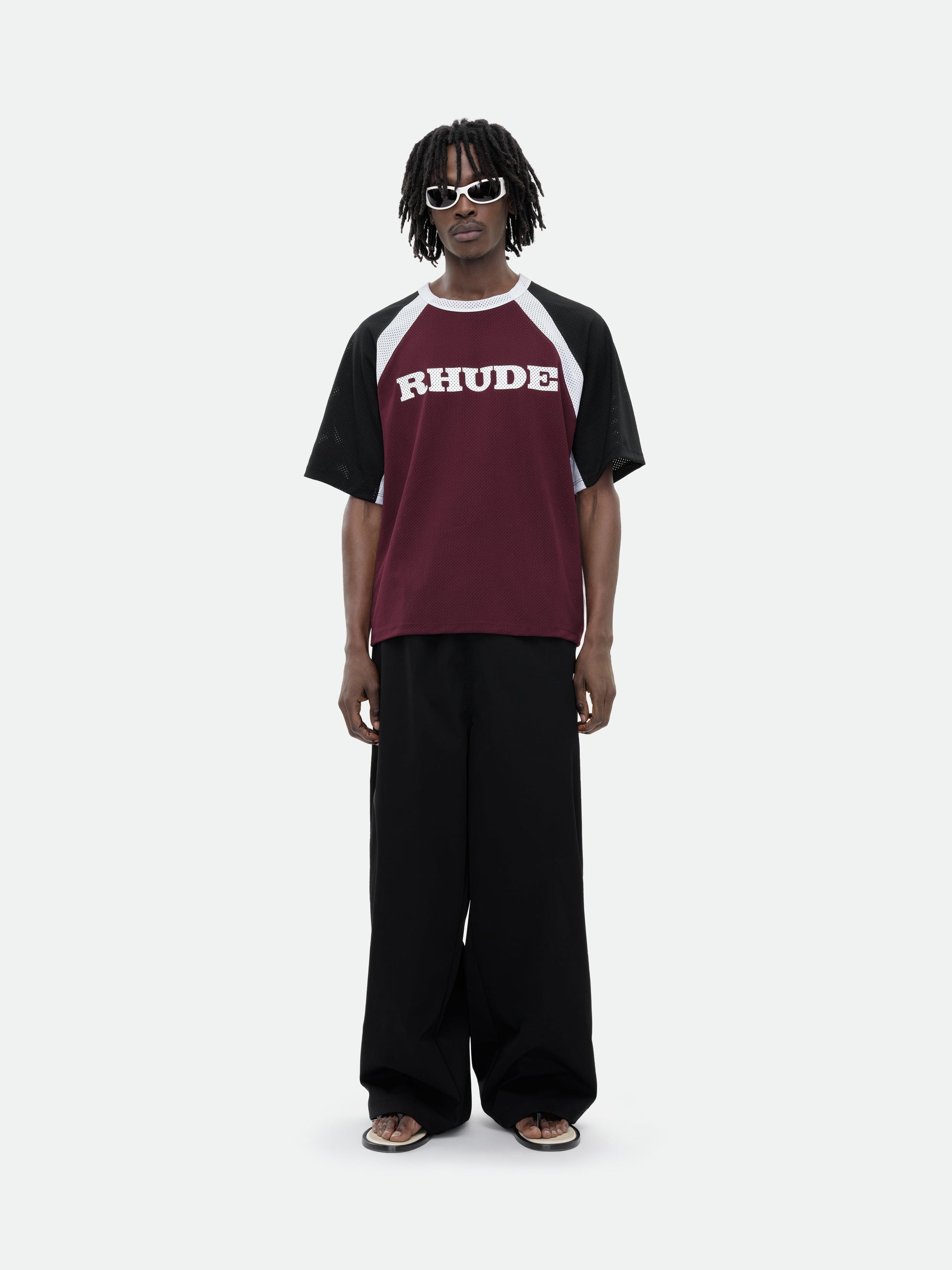 Premium tee crafted from soft, lightweight fabric. Rhude jersey logo graphic showcased on the front. Features a comfortable and relaxed custom Rhude fit. The dropped shoulders adds a sporty touch to this classic short sleeve.