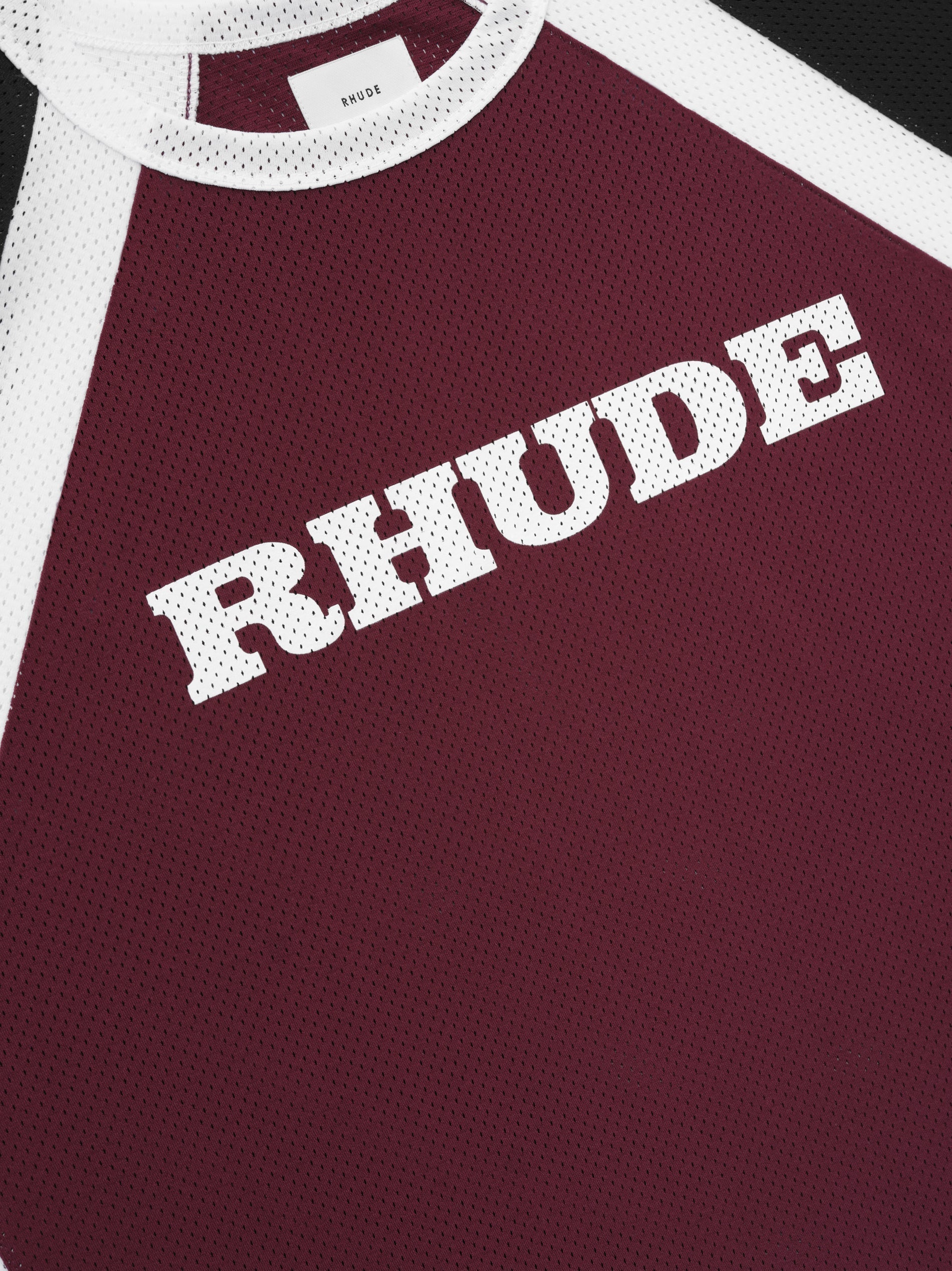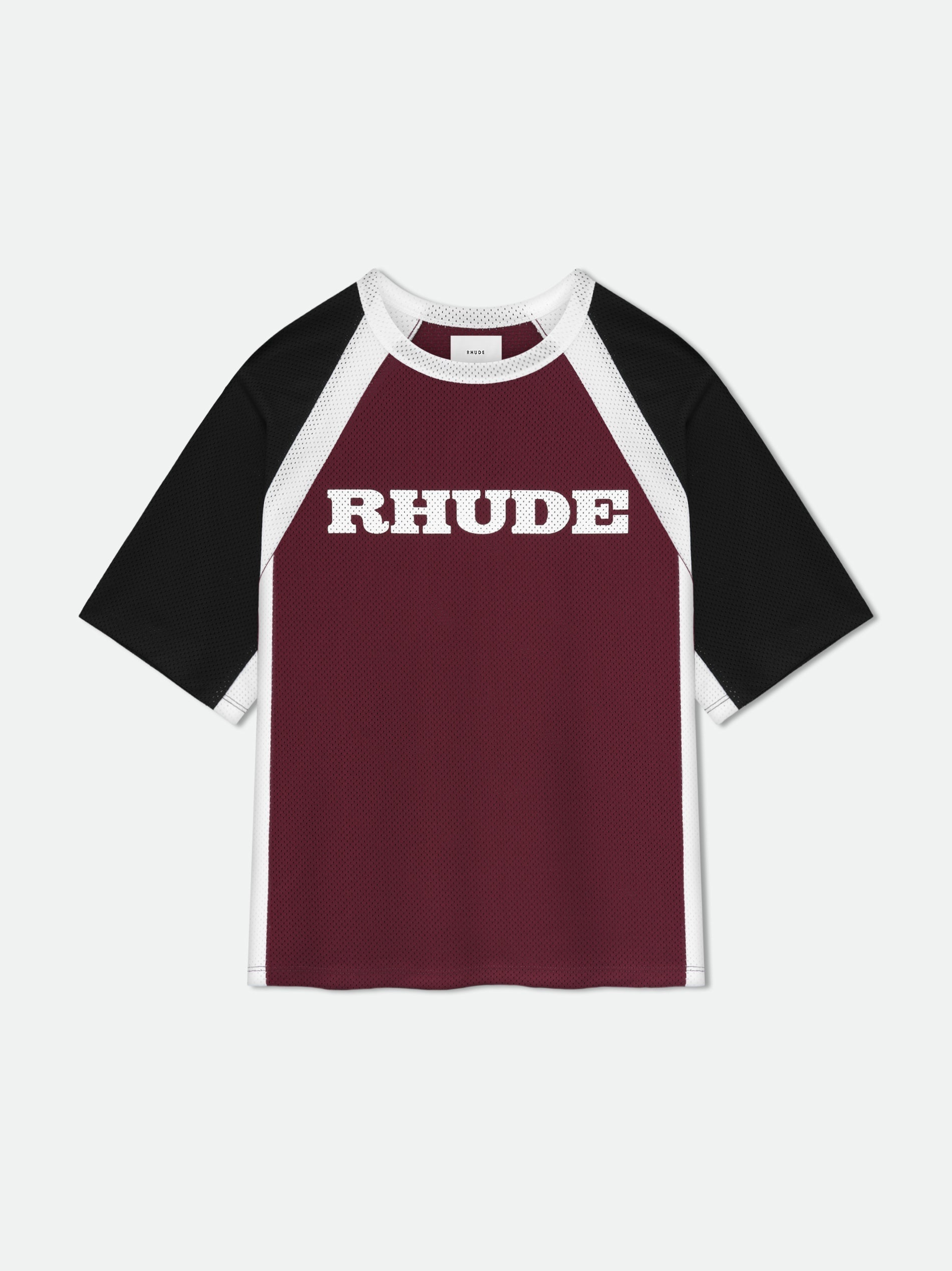 Premium tee crafted from soft, lightweight fabric. Rhude jersey logo graphic showcased on the front. Features a comfortable and relaxed custom Rhude fit. The dropped shoulders adds a sporty touch to this classic short sleeve.