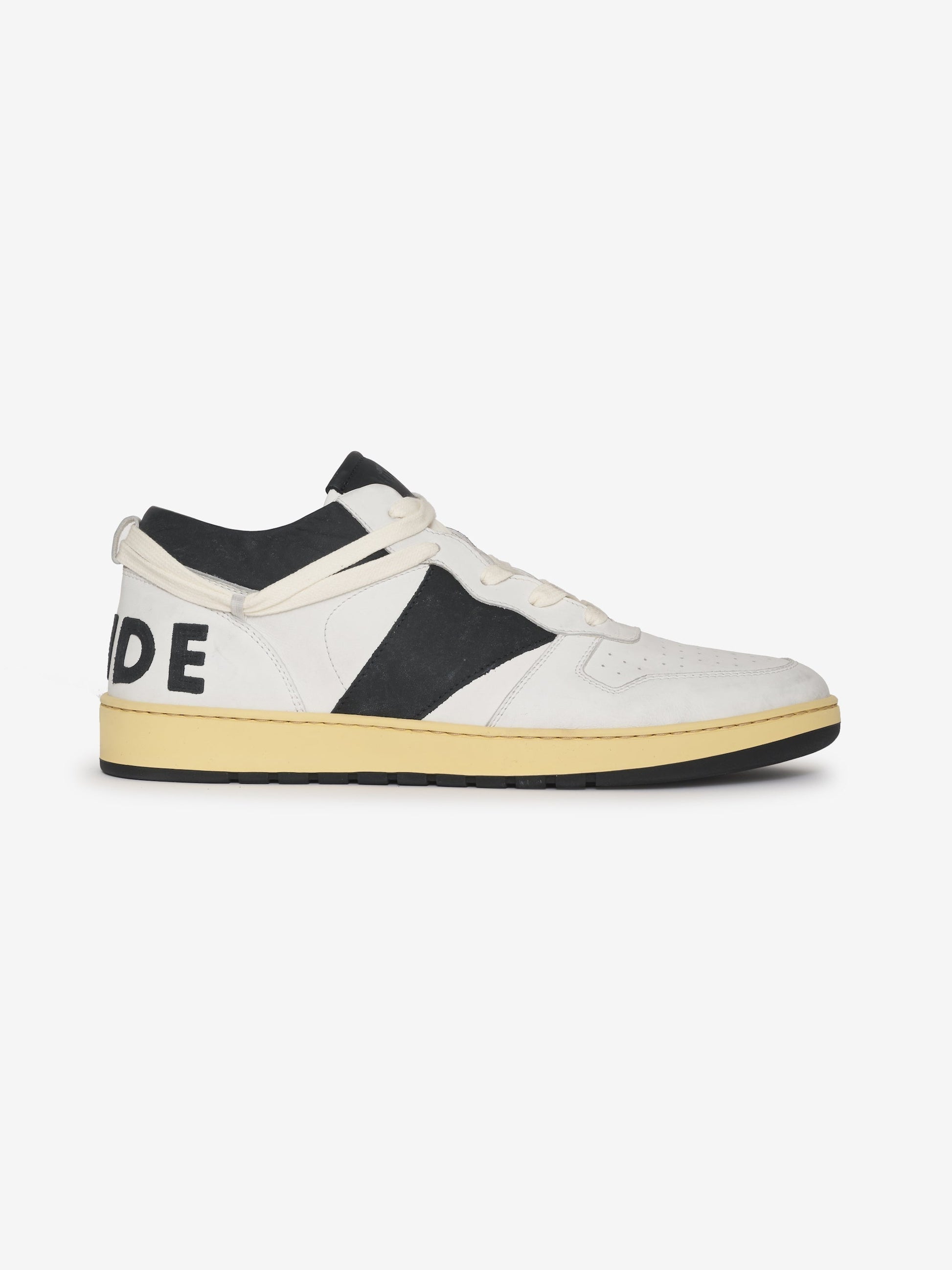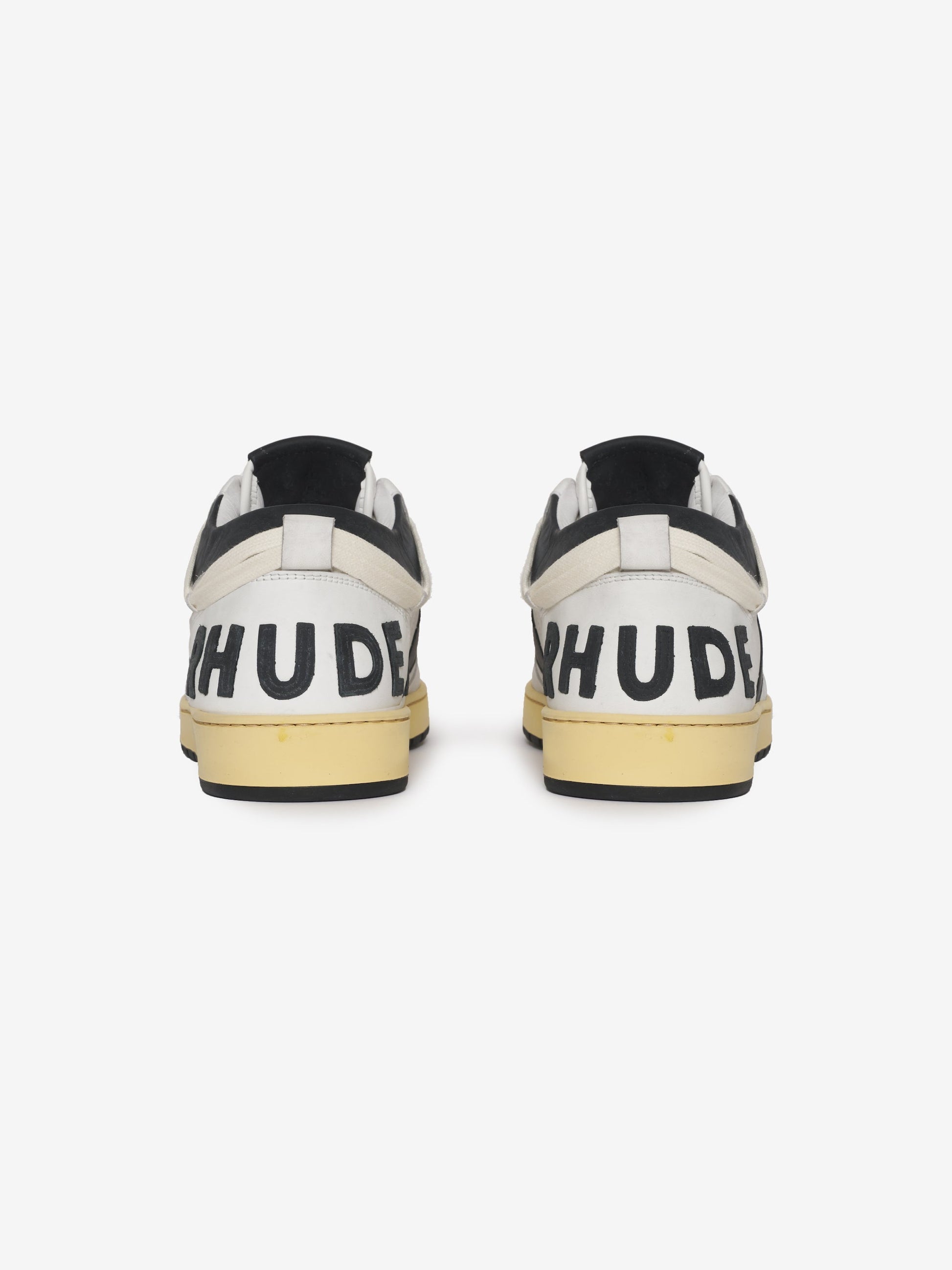 Low top leather basketball sneaker with vintage details. Hand distressed abrasions and imperfections throughout. Vintaged yellow sole. Leather logo heel appliqué.