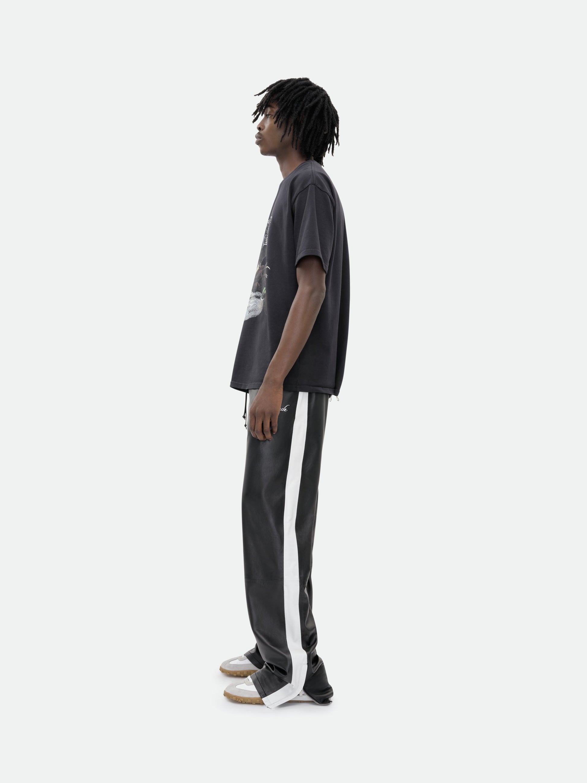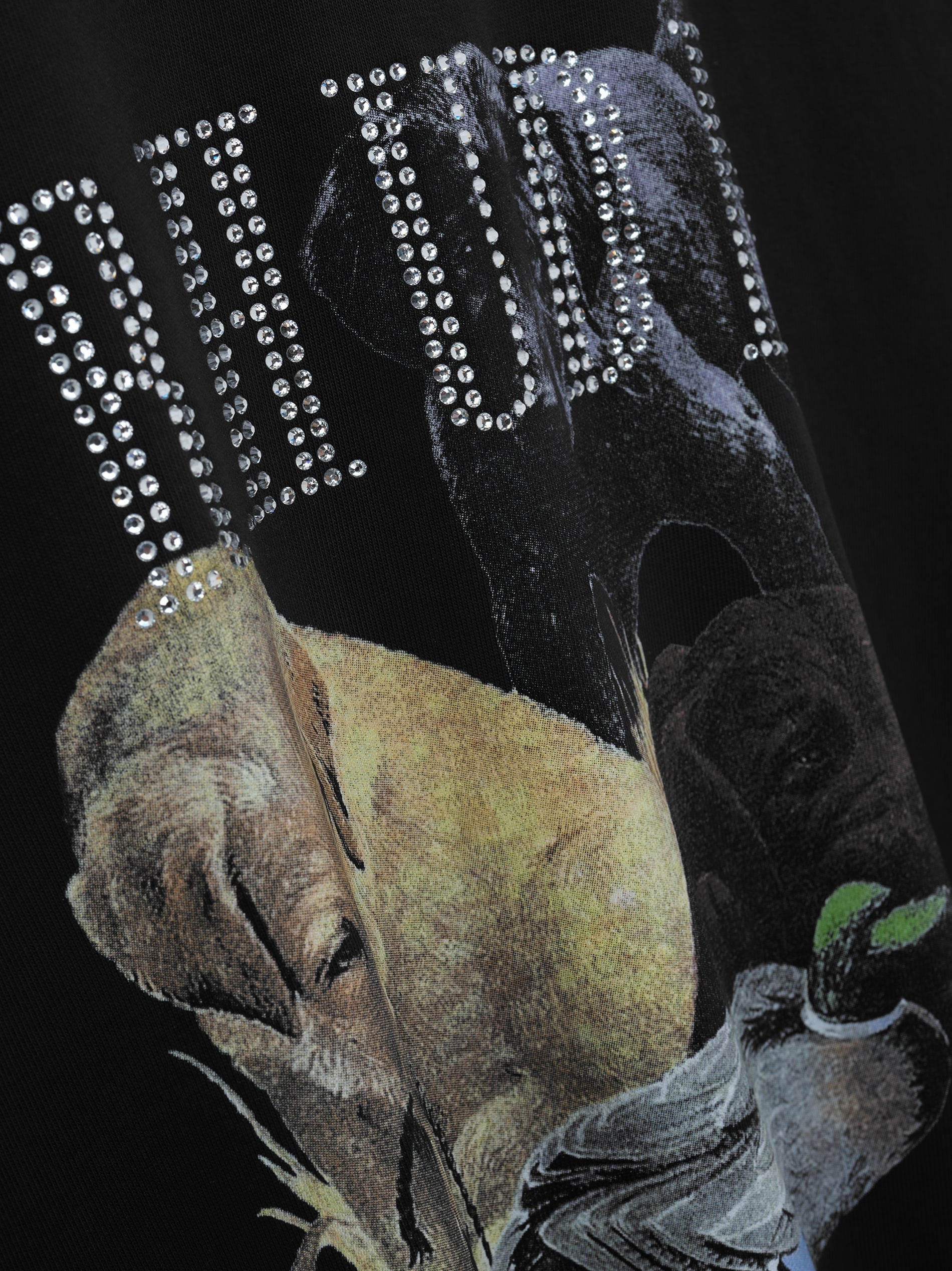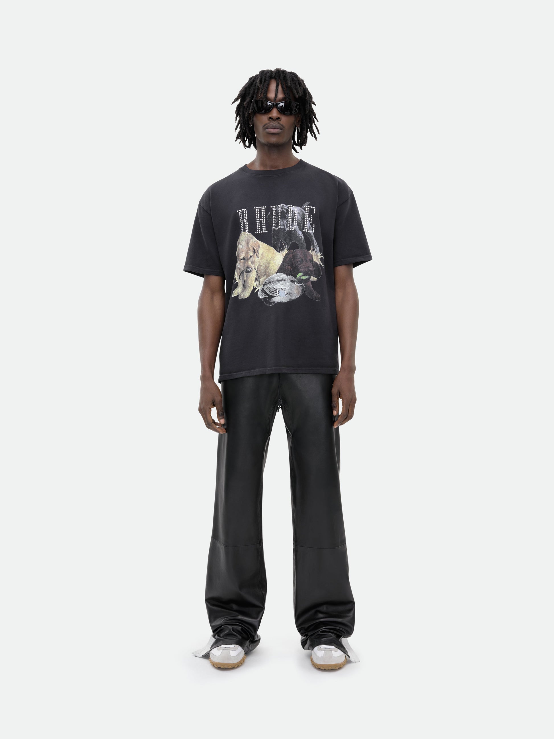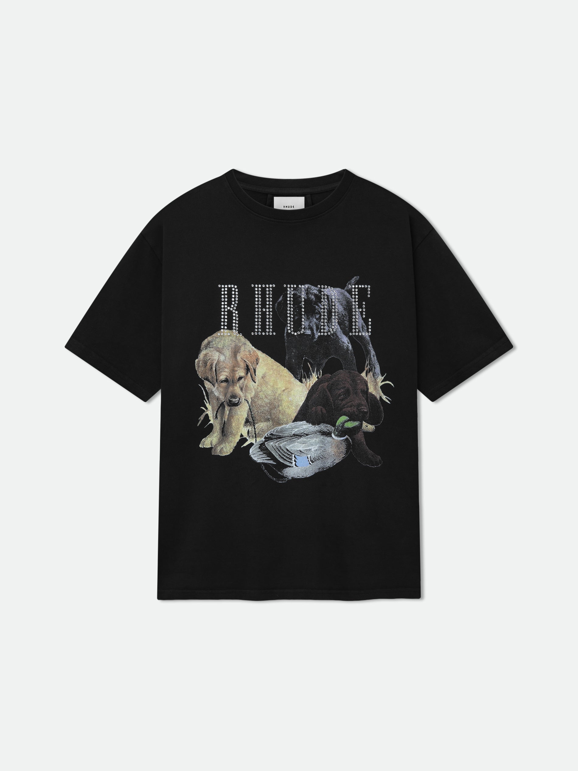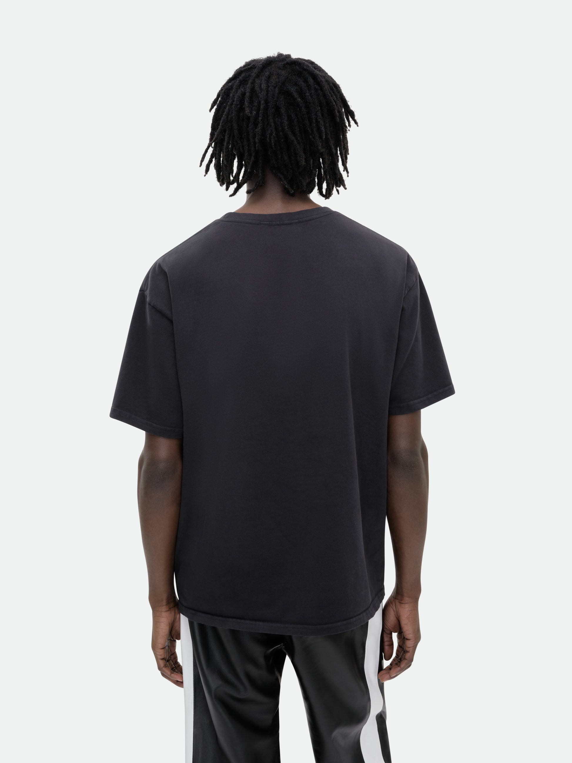 Custom-fit vintage wash cotton short sleeve tee-shirt features Rhude logo embellished with rhinestones, printed graphics printed at front, with a clean back.
