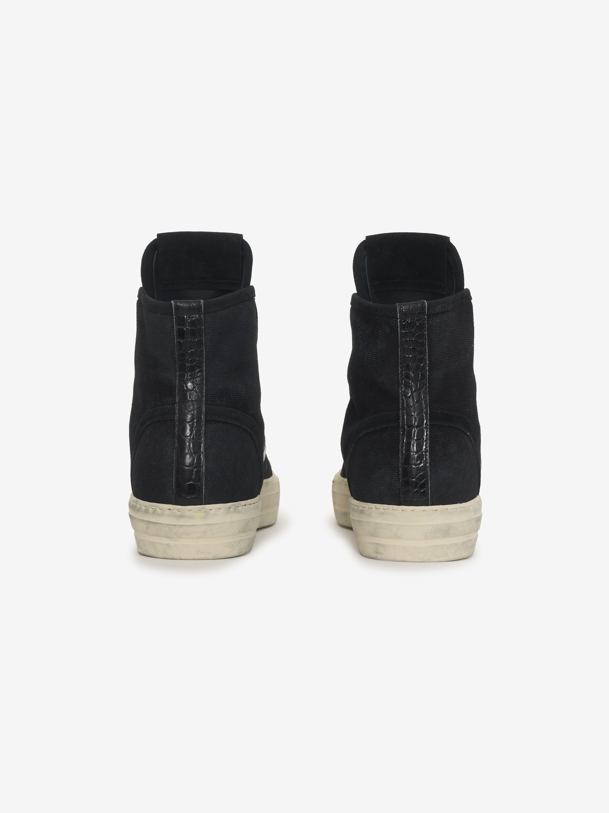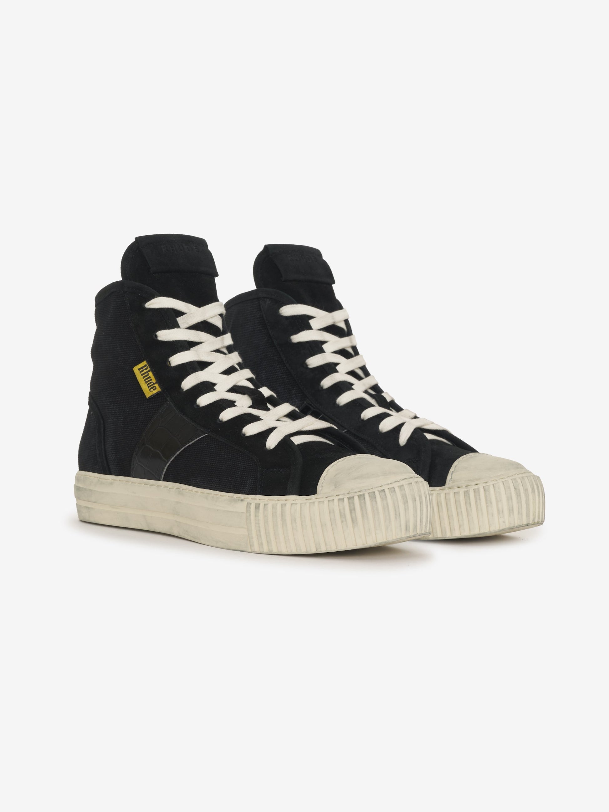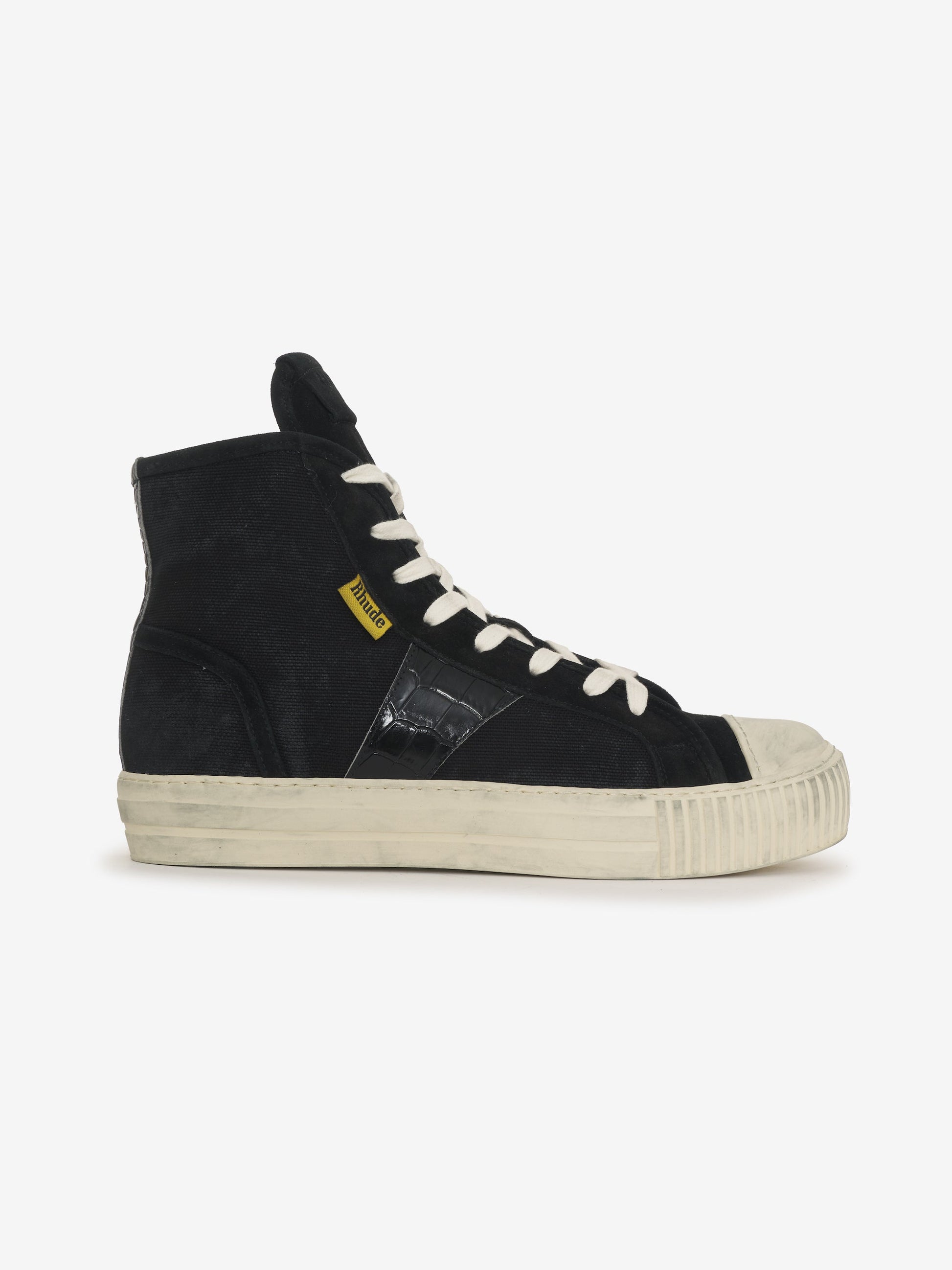 High top blend of canvas, suede, and rubber that constructs the upper, supported by a sturdy manmade sole. Crafted with precision in Italy, these shoes boast a lace-up front, allowing for a customizable fit that suits your comfort. Along the sides, a faux snake print embellishment introduces an intriguing element to the design.
