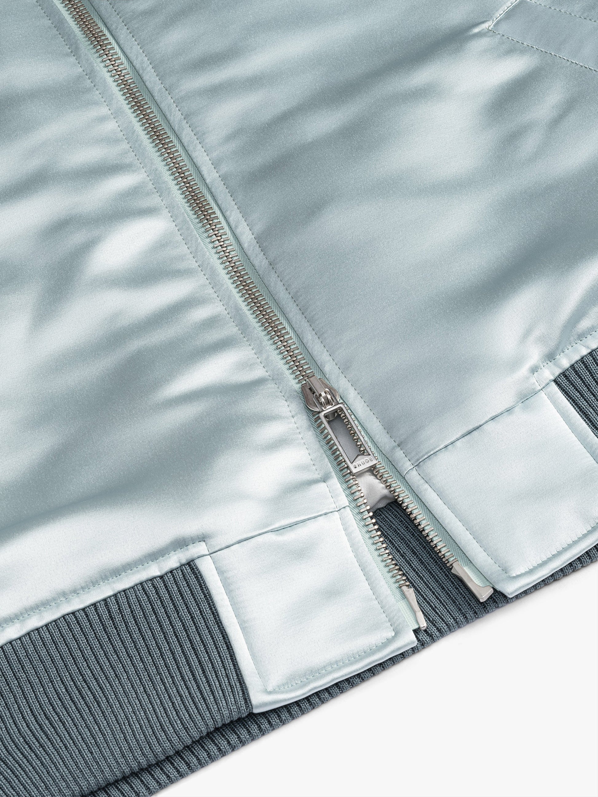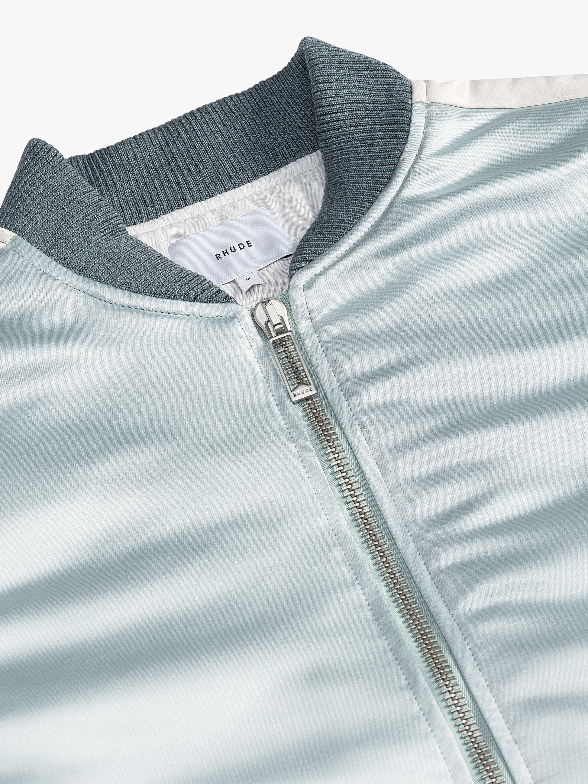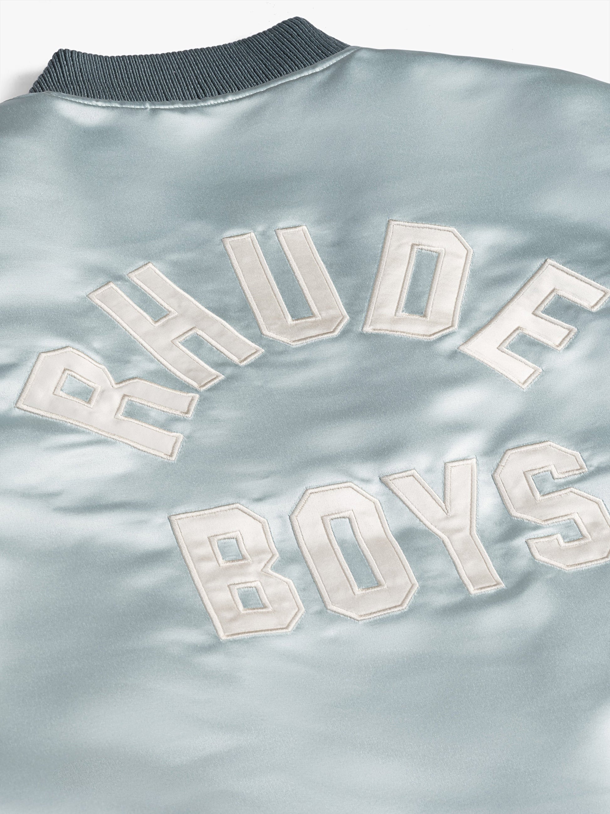 Premium zip up Rhude Boys satin bomber jacket featuring RHUDE BOYS embroidered on back, custom Rhude two-way zipper closure with pill hardware, a stand collar, ribbed waist and cuffs.