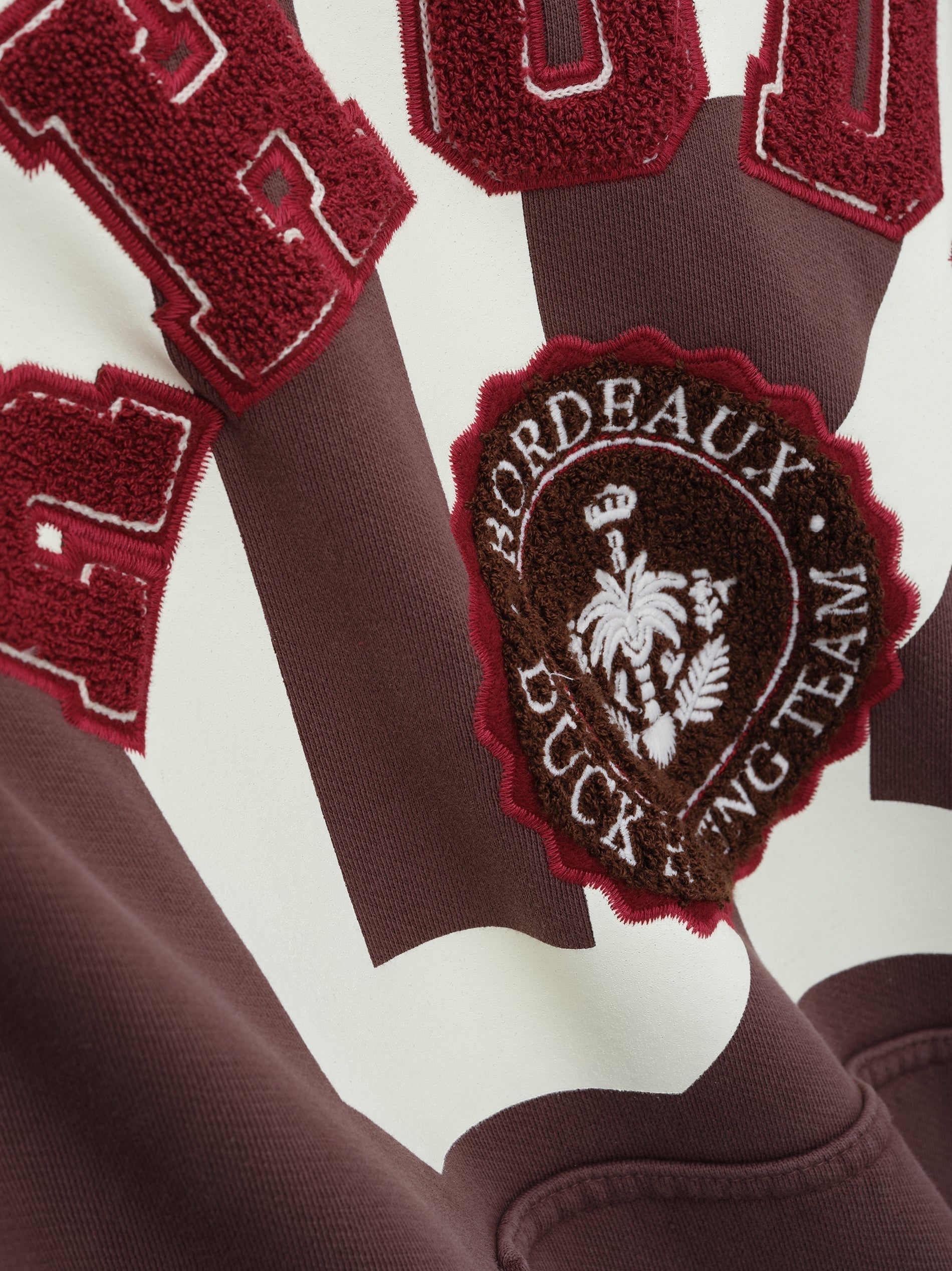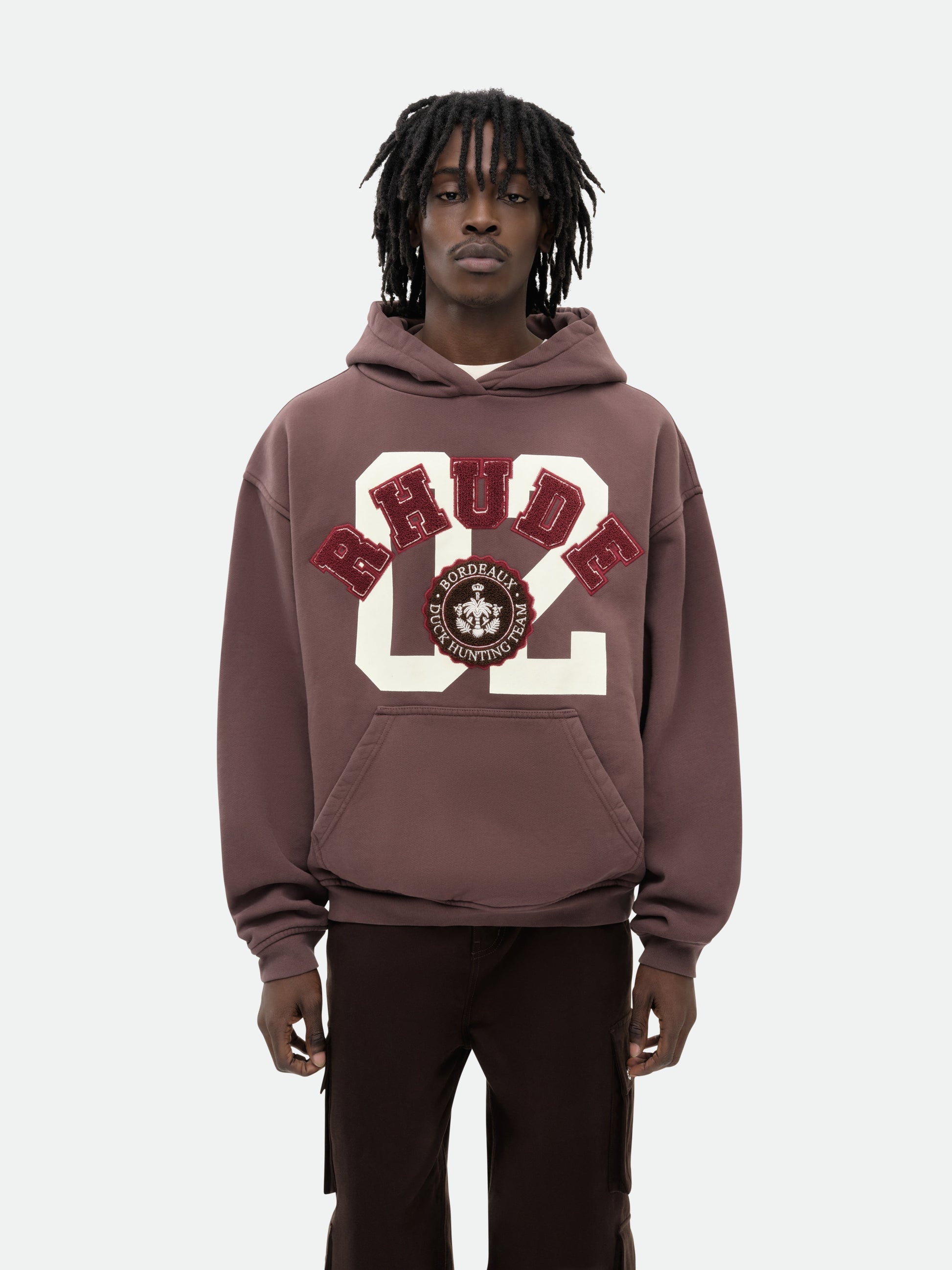 Long sleeve French Terry Bordeaux Hoodie with Chenille hand cut letters and crest placed on top of 02 printed graphic, with a clean back. Featuring a kangaroo front pocket and dropped shoulders. Each piece is unique and print distressing my vary per style.