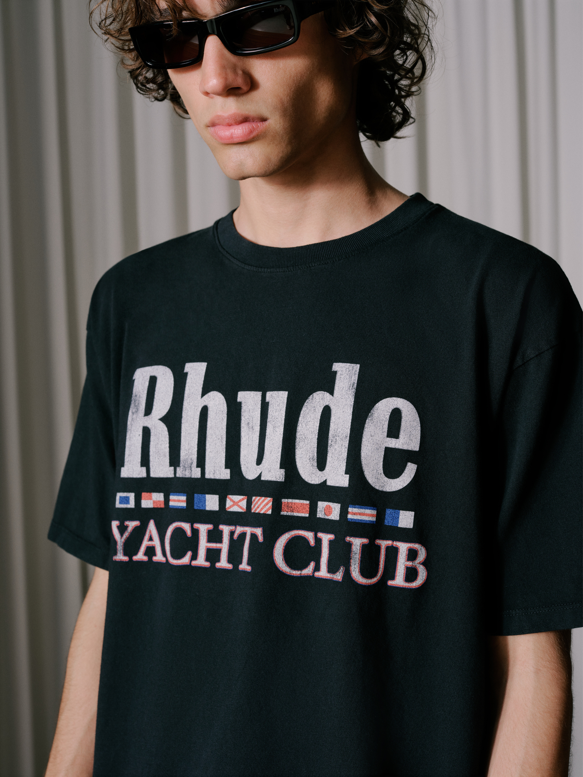 Custom-vintage fit cotton tee shirt with a ribbed neckline and short sleeves. Features RHUDE Yacht Club Flag designs printed on front.