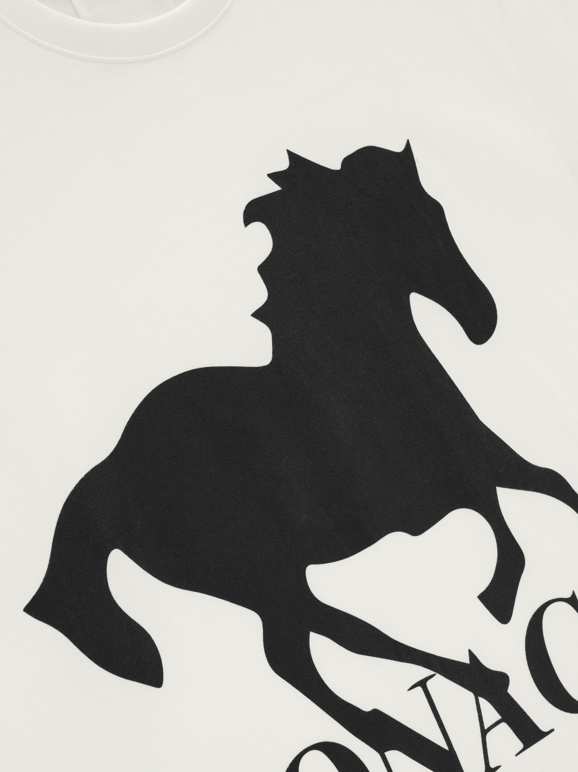Custom-vintage fit cotton tee shirt with a ribbed neckline and short sleeves. Features "RHUDE Monaco With Gods Help" designs printed on front.
