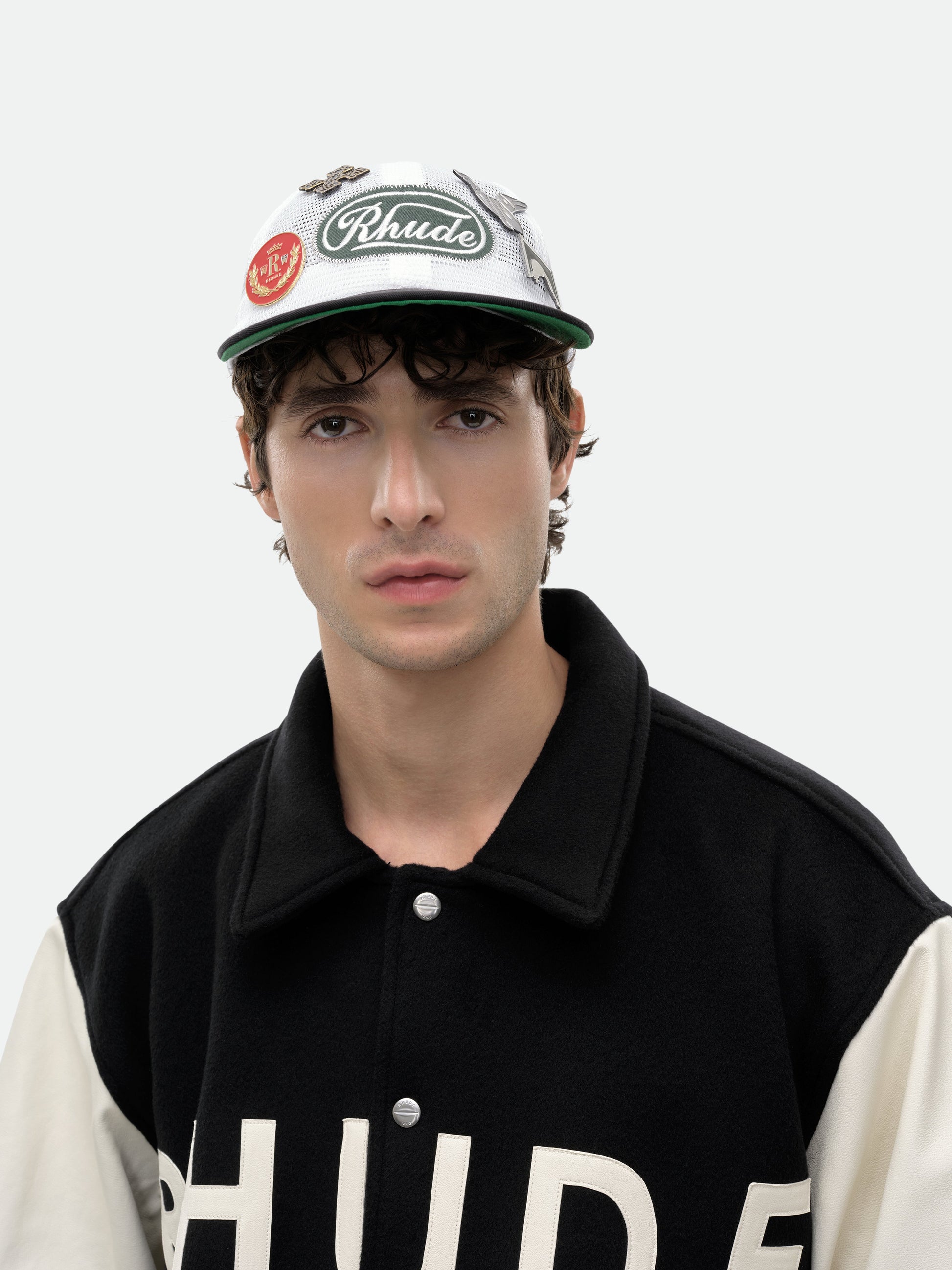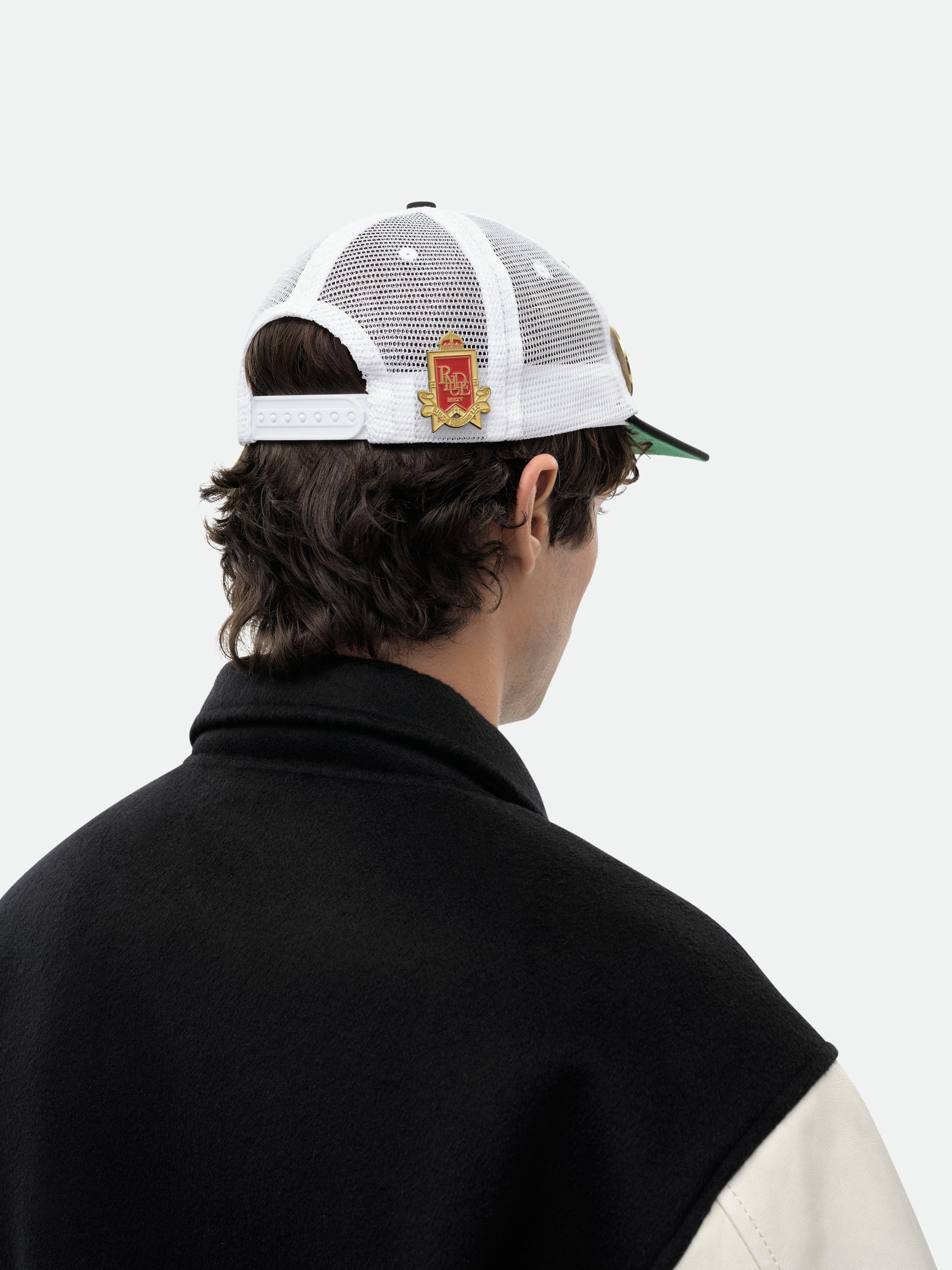 Heavyweight vintage trucker cap fully constructed with a breathable mesh material. Includes custom Rhude pins throughout (5). Features an adjustable snap strap at the back, so you can adjust the fit to your preference, and green under brim.