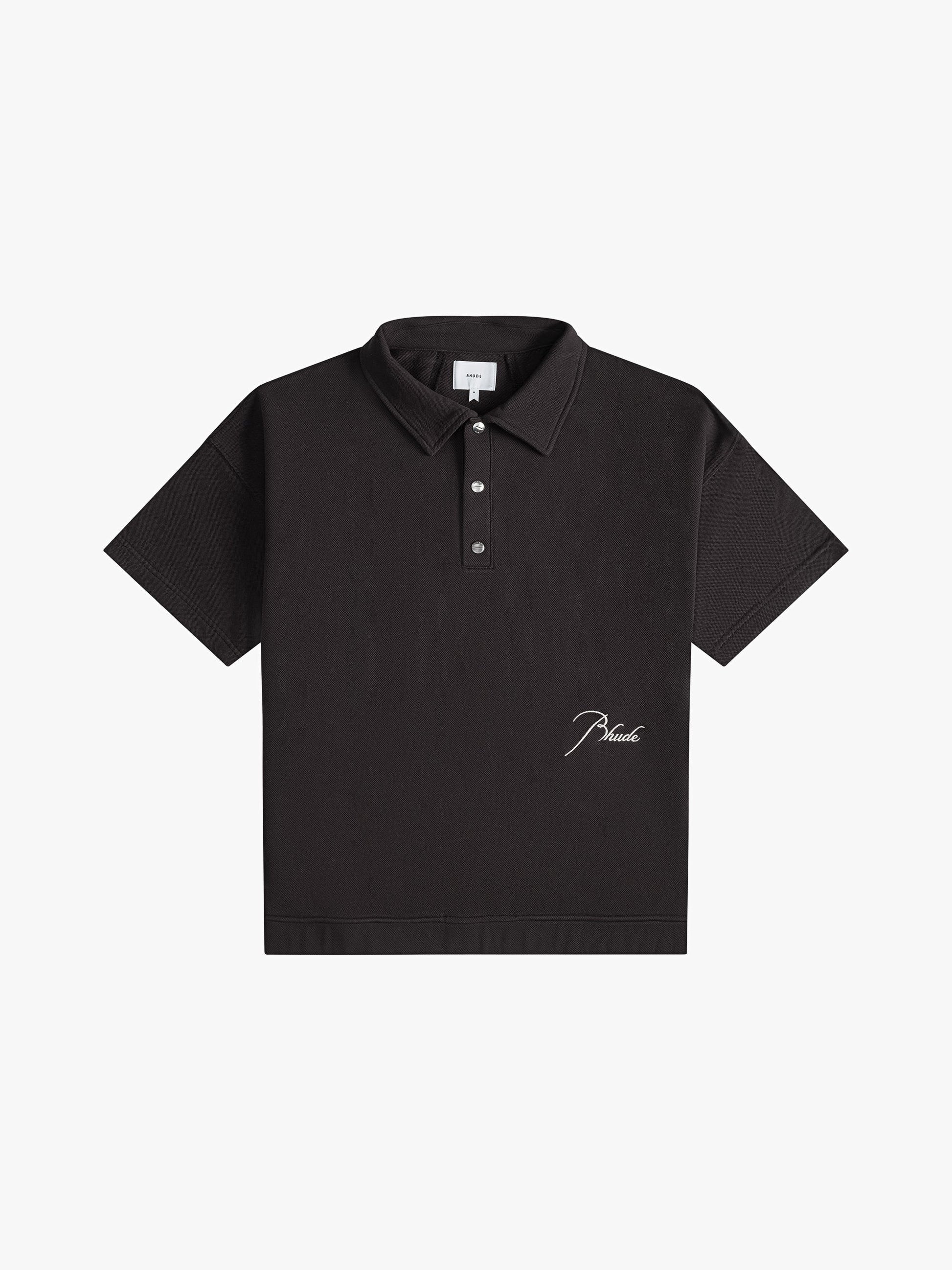Premium track polo made from stylish pique cotton for a refined aesthetic and enhanced comfort. The 1x1 ribbing on the collar and cuffs provides a comfortable and secure fit. Features quarter front opening at collar, with custom Rhude closures, and front twin side pockets.