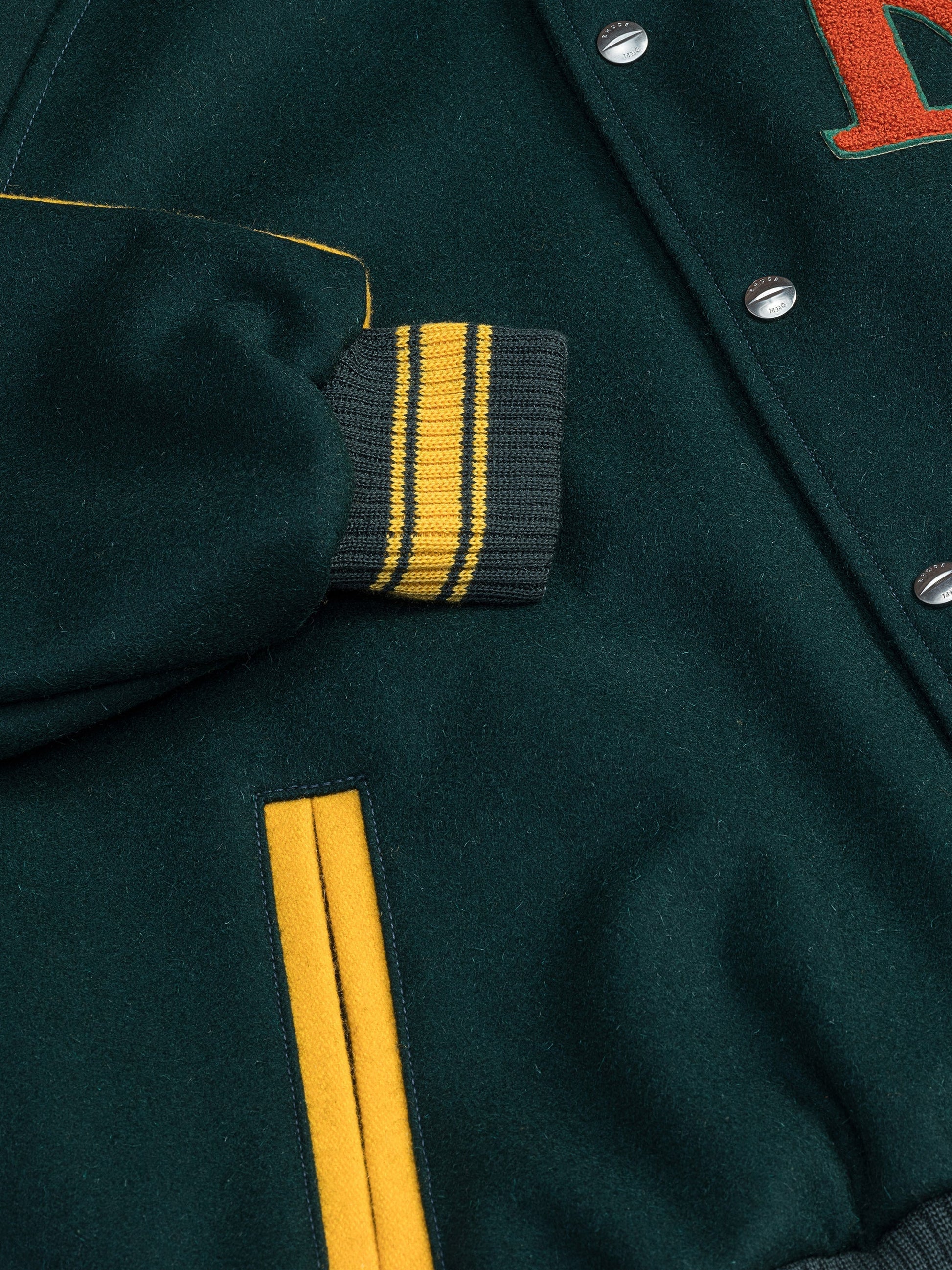 Premium wool varsity jacket features Rhude piping down each arm, twin pockets, a cropped hem, a ribbed collar, waist and cuffs. Custom rhude pill snap hardware.