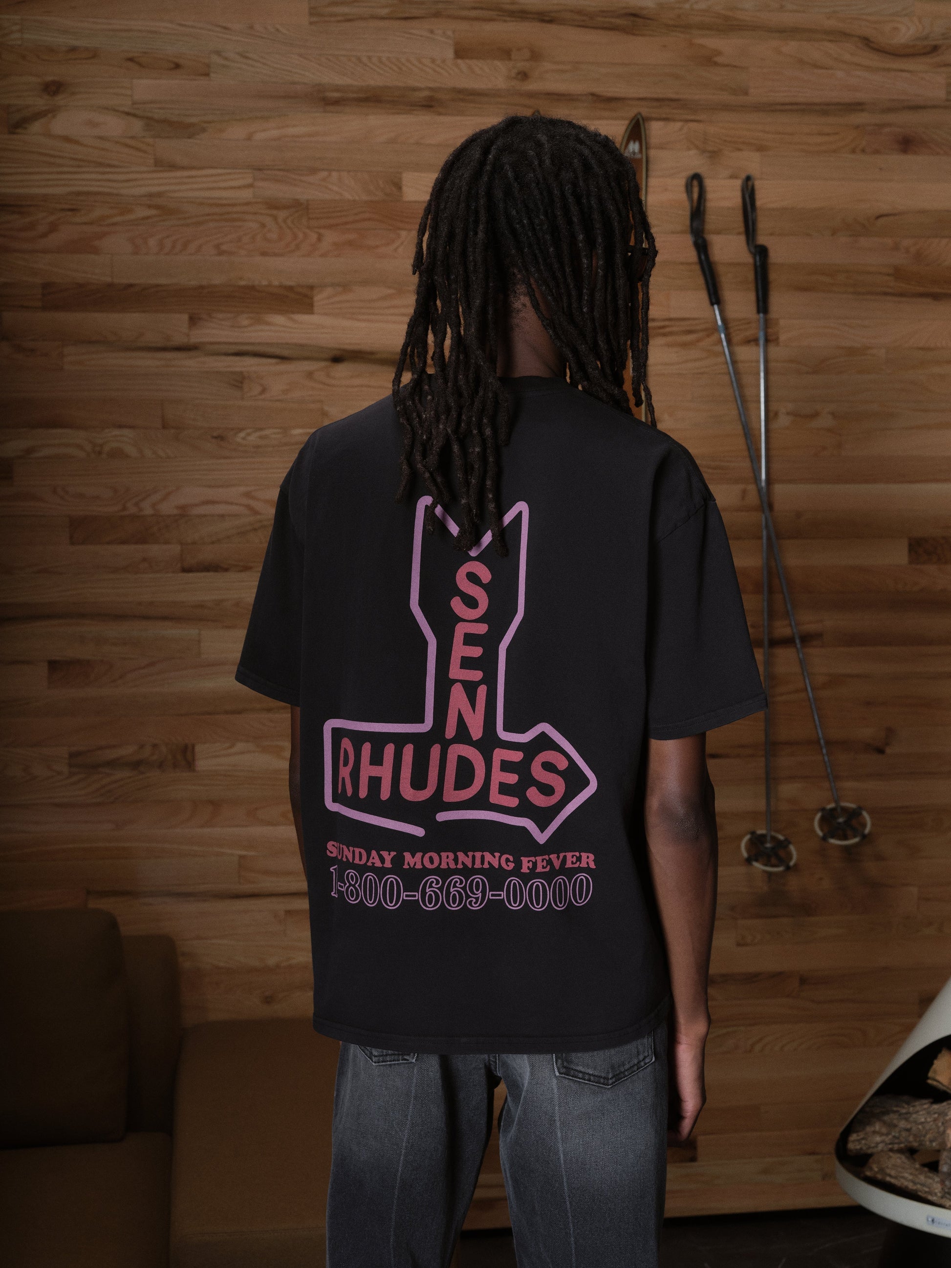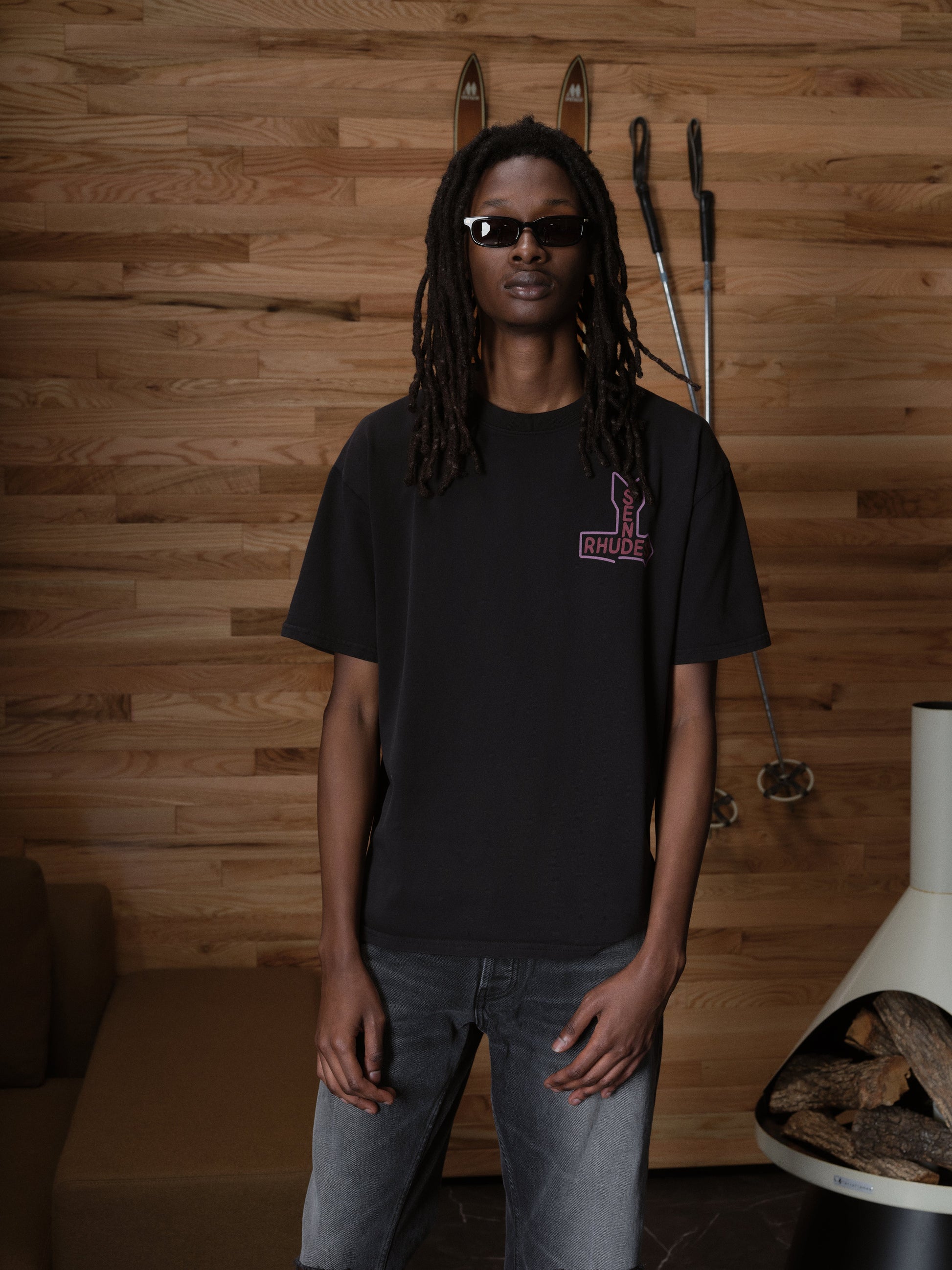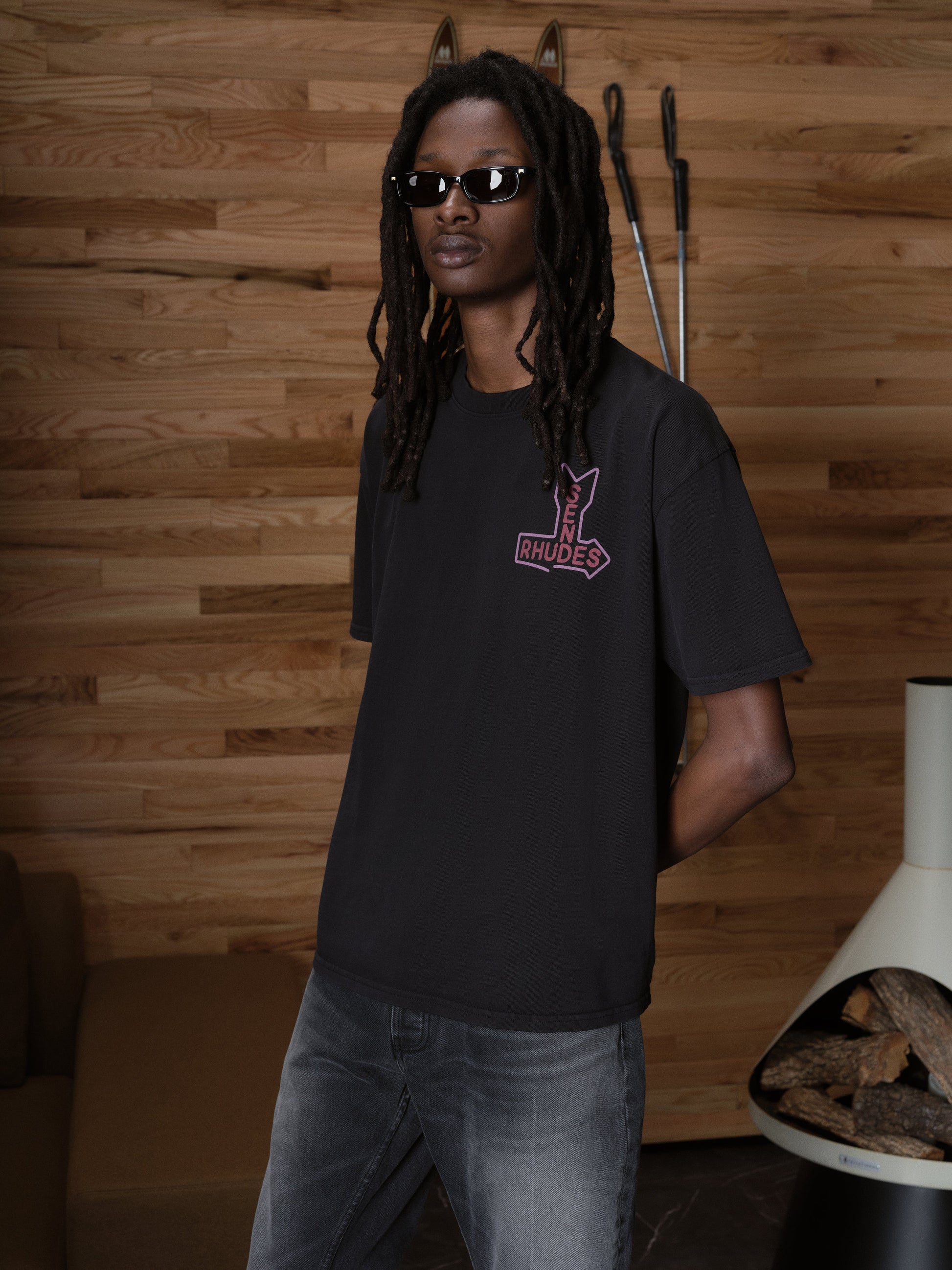Custom-vintage fit cotton tee shirt with a ribbed neckline and short sleeves. Features RHUDE Send Rhudes designs printed on front and back.