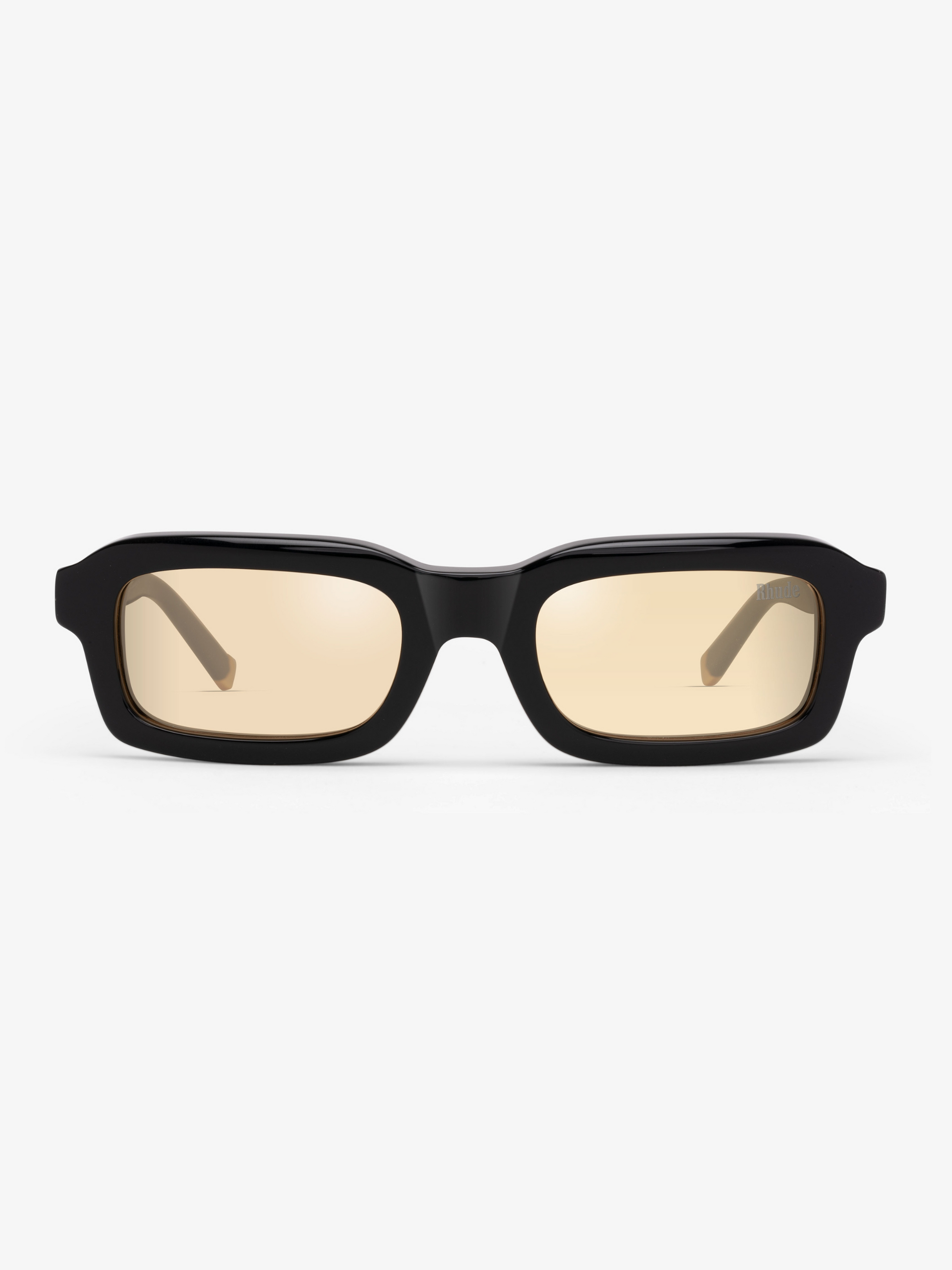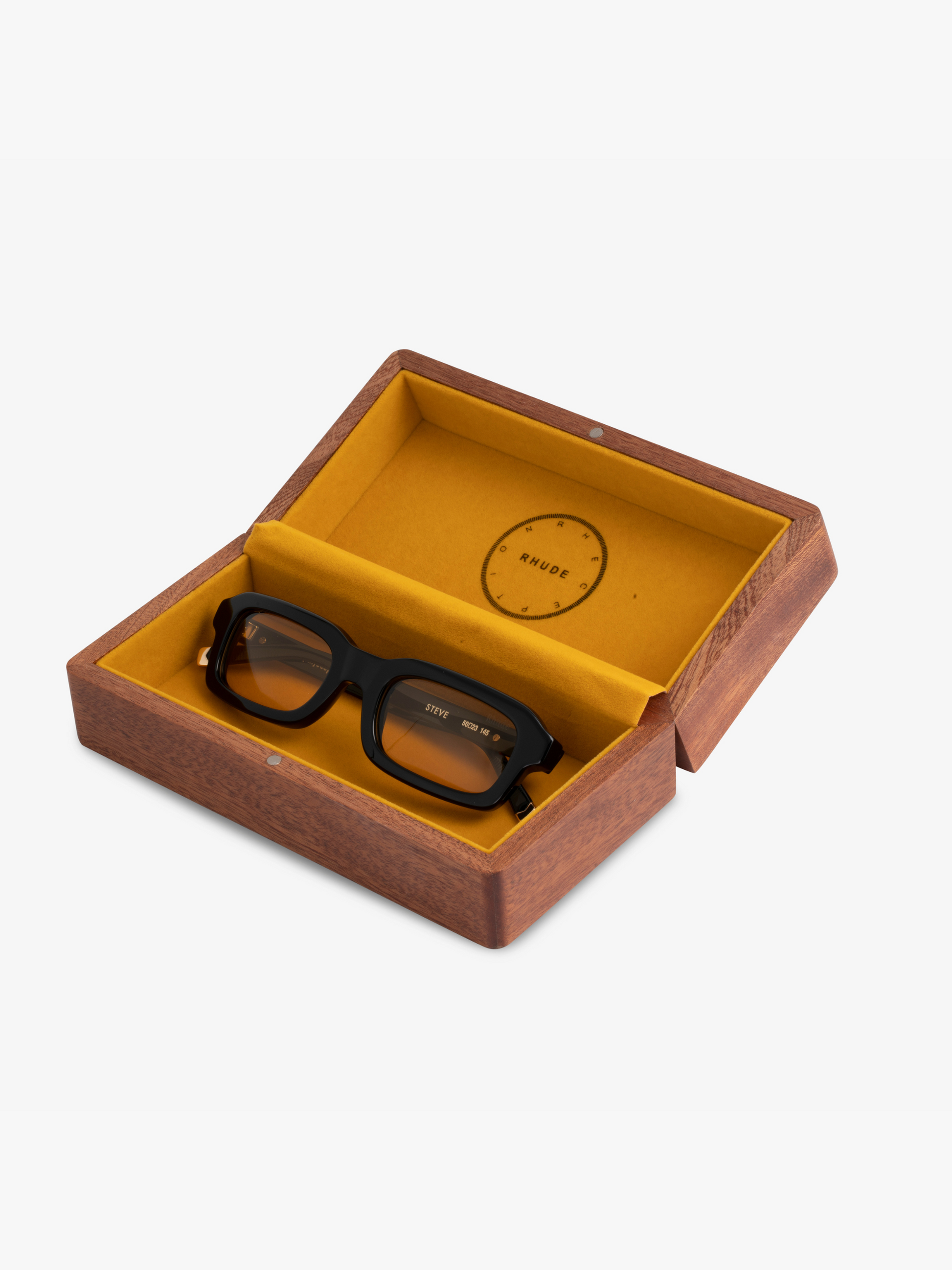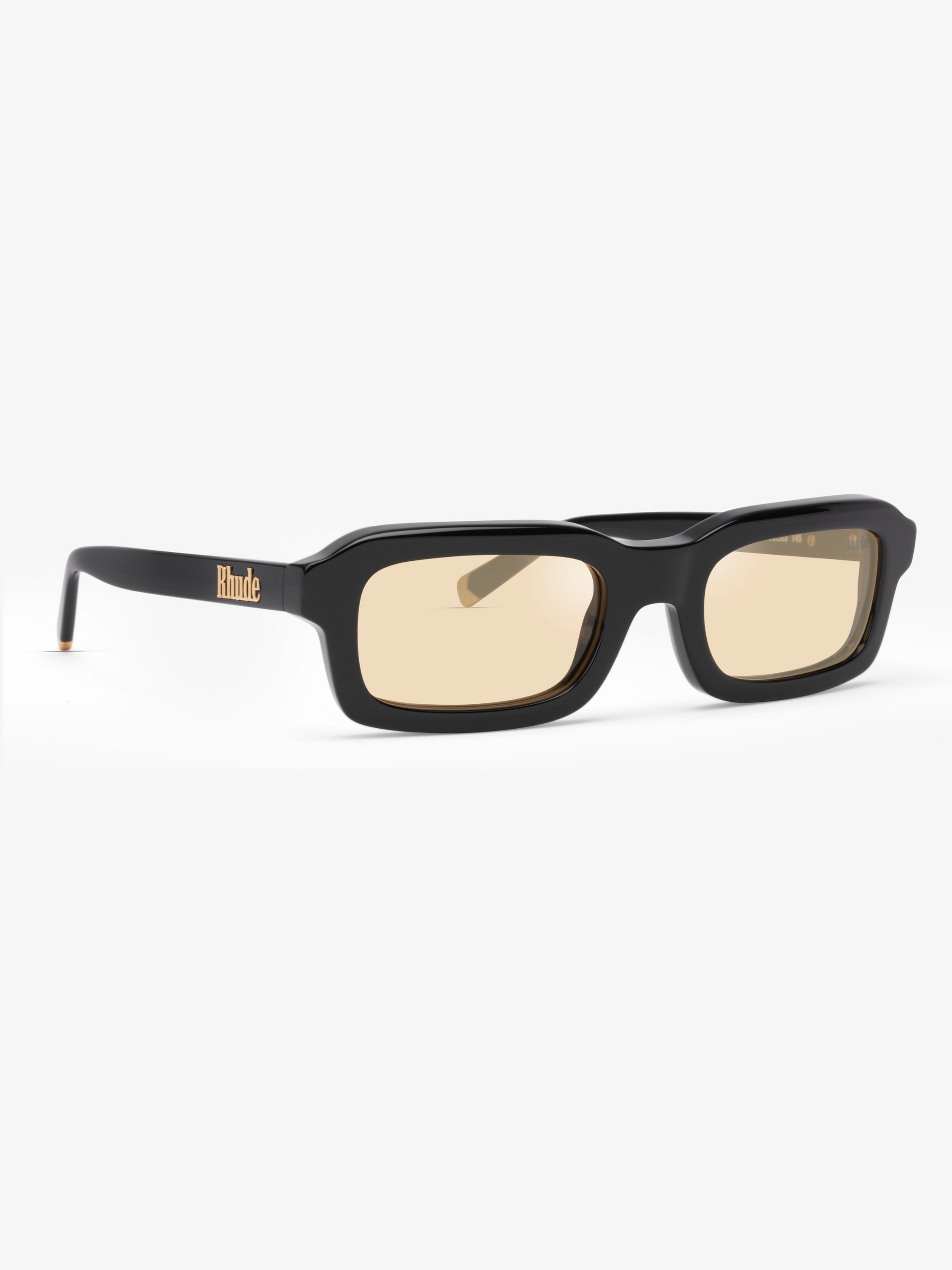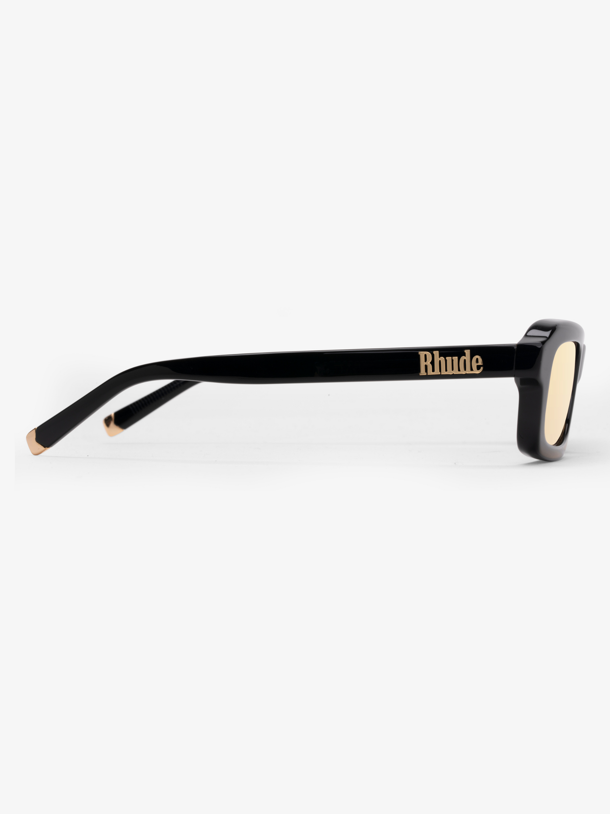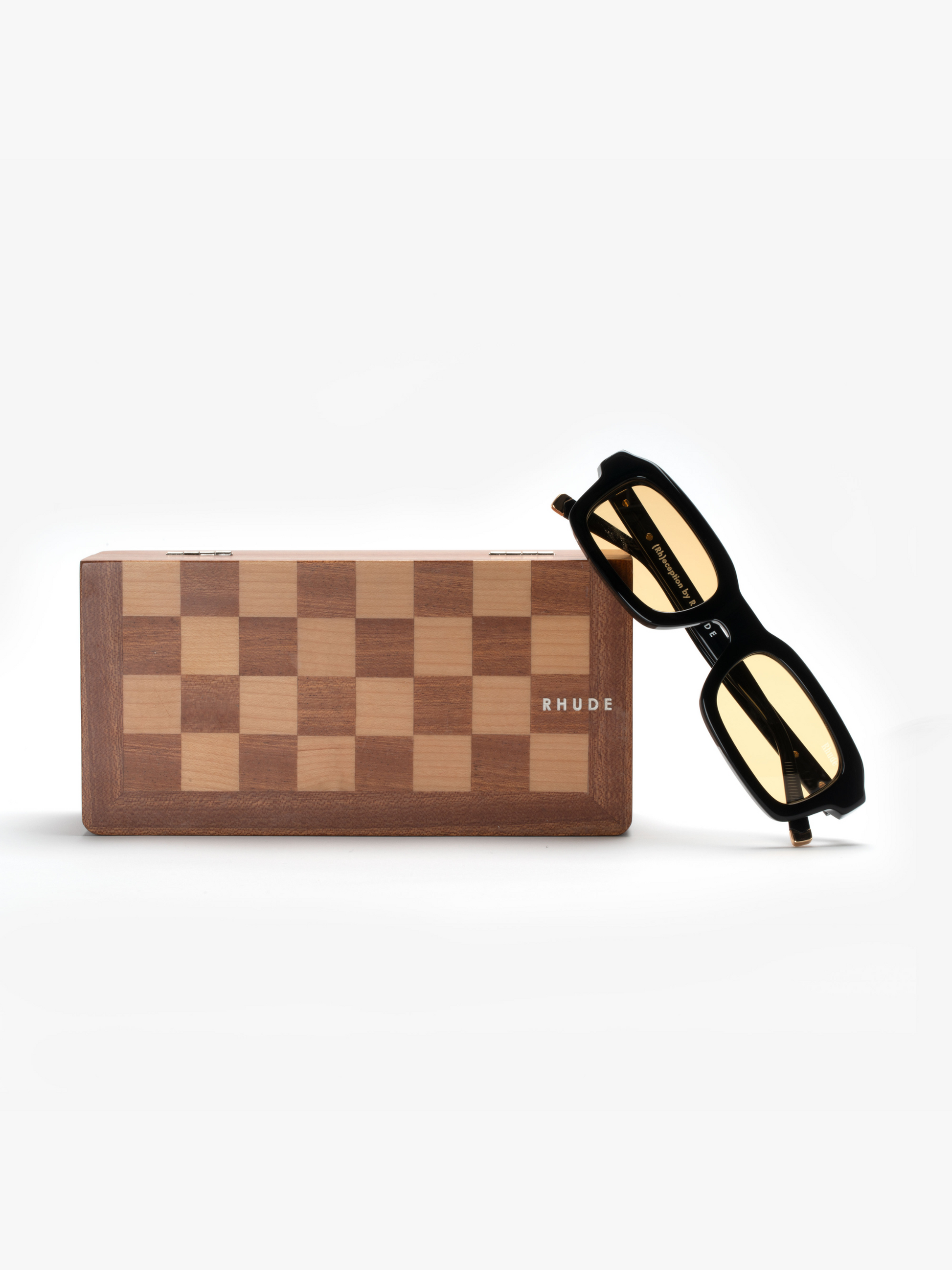 Premium acetate sunglasses handmade in Japan. Offered in a classic black frame with yellow-tinted lenses, featuring UV protection. Features "Rhude" logo positioned on the side of each temple. Hardwood case with chess board pattern and magnetic closure included.