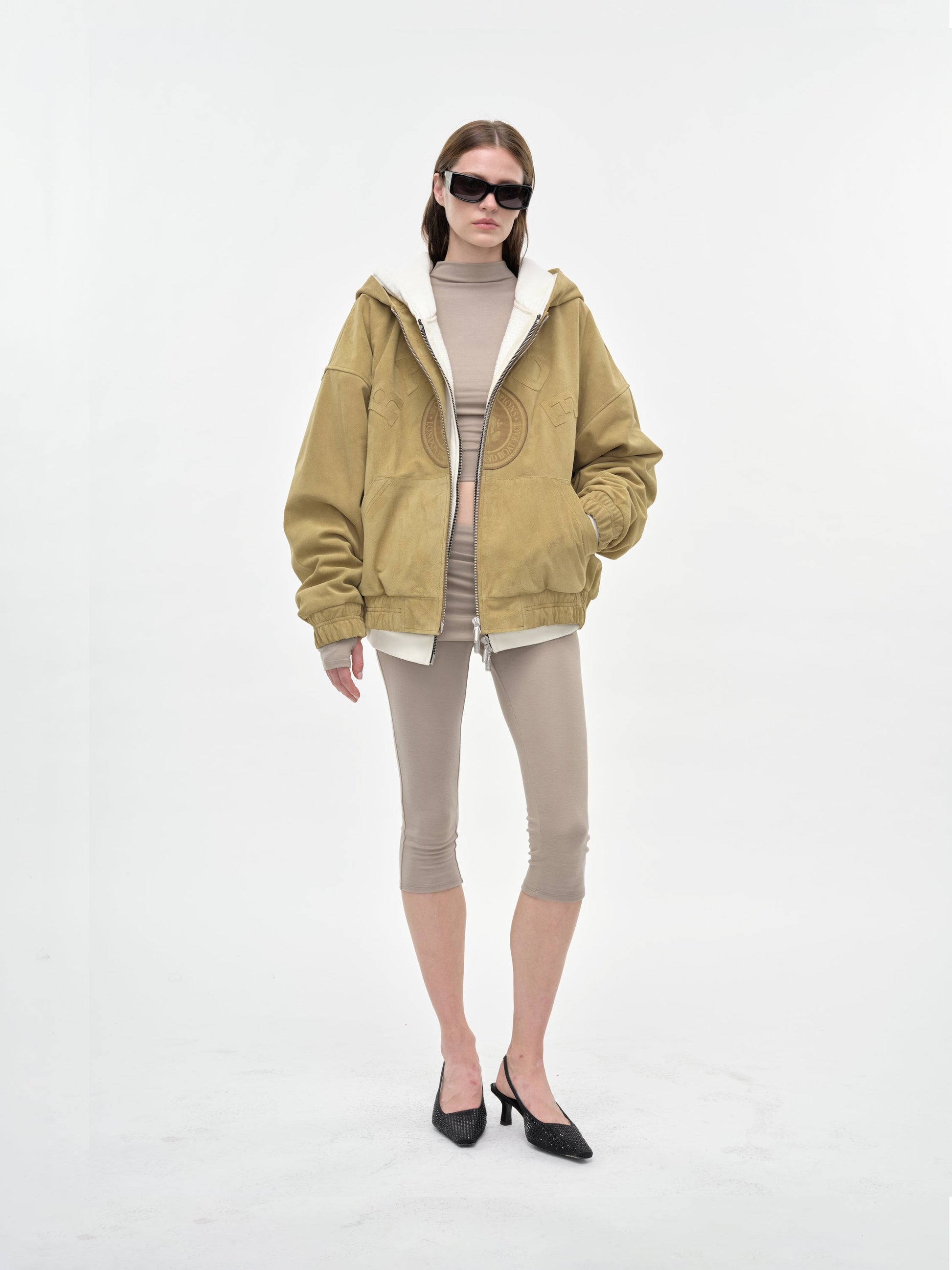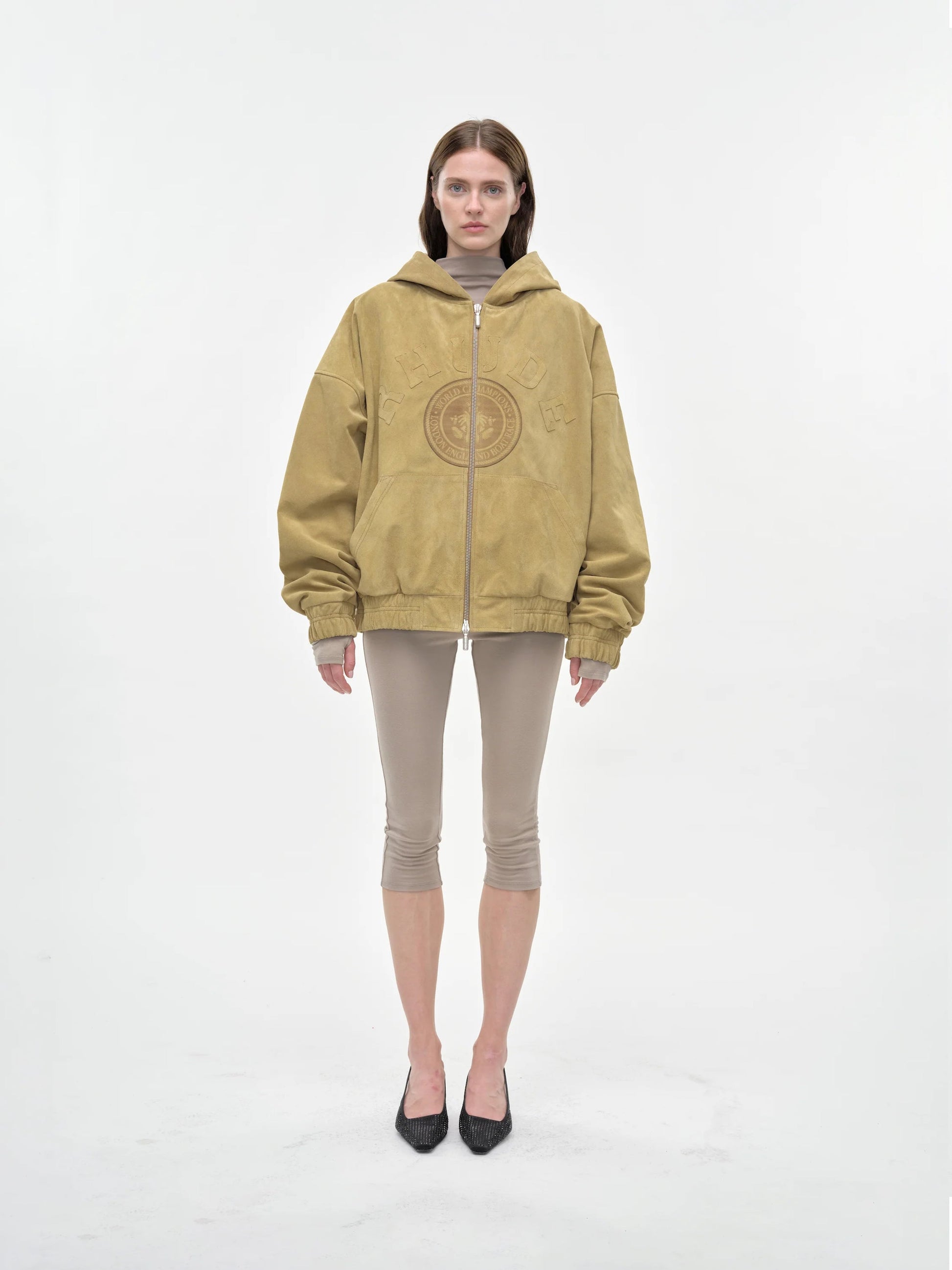 Crafted from high-quality suede leather, this varsity jacket with a hood, boasts a Rhude two-way zipper with custom pill hardware. Features "Rhude" suede lettering patches, and a ribbed waist and cuffs.