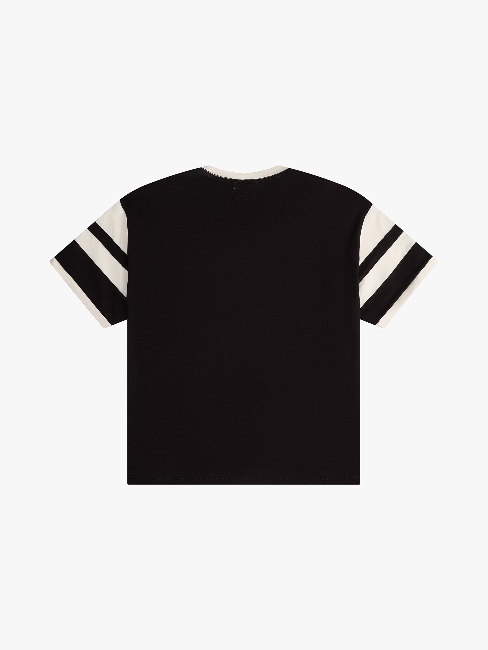Premium tee crafted from soft, lightweight fabric. Rhude Sugarland jersey graphic showcased on the front. Features a comfortable and relaxed custom Rhude fit. The multi stripe design on the sleeves adds a sporty touch to this classic short sleeve.