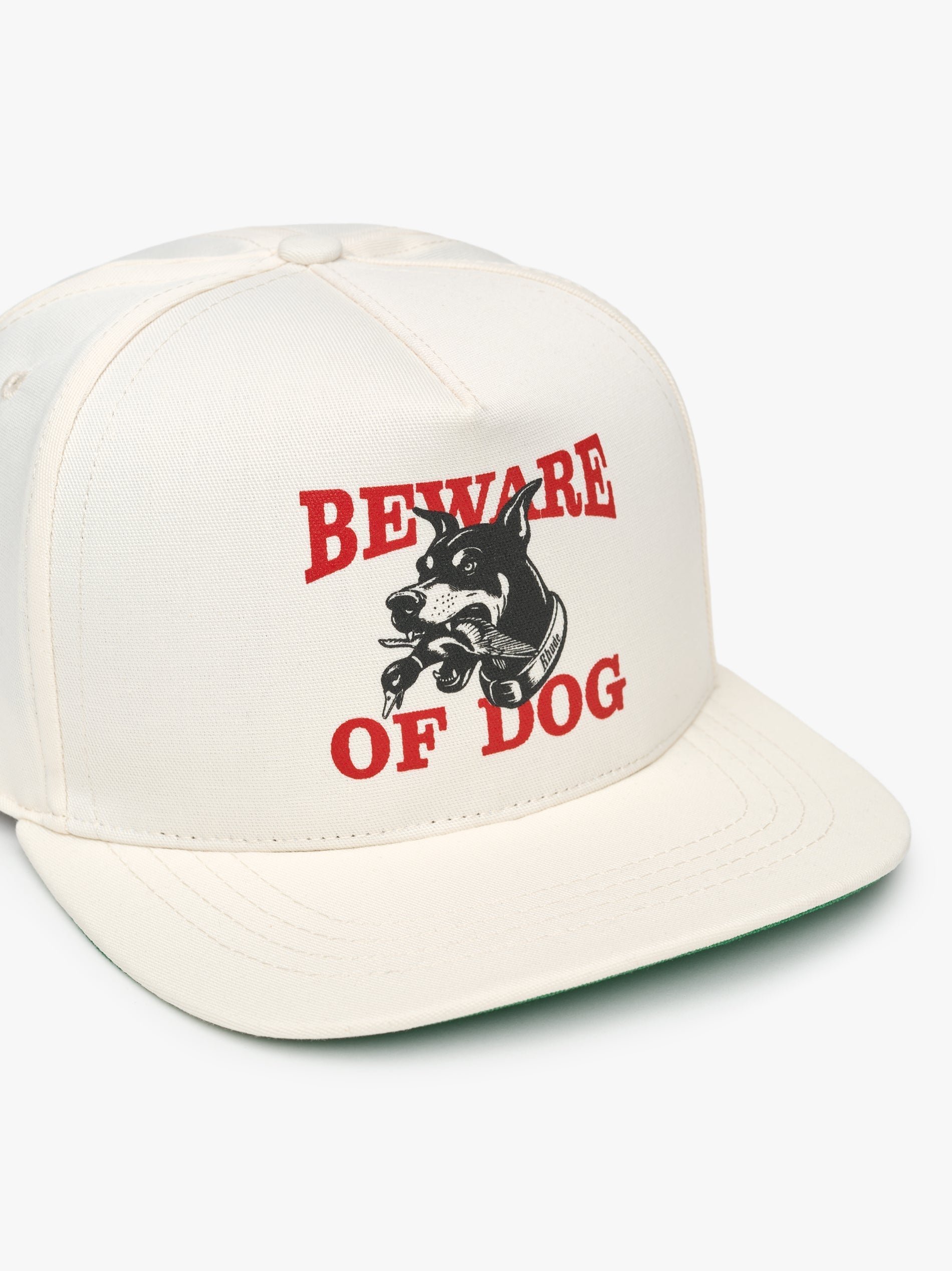 Heavyweight vintage trucker cap with Rhude "Beware of Dog" warning label on the front panel. Features an adjustable strap at the back with Rhude chevron hardware, so you can adjust the fit to your preference, and green under brim.
