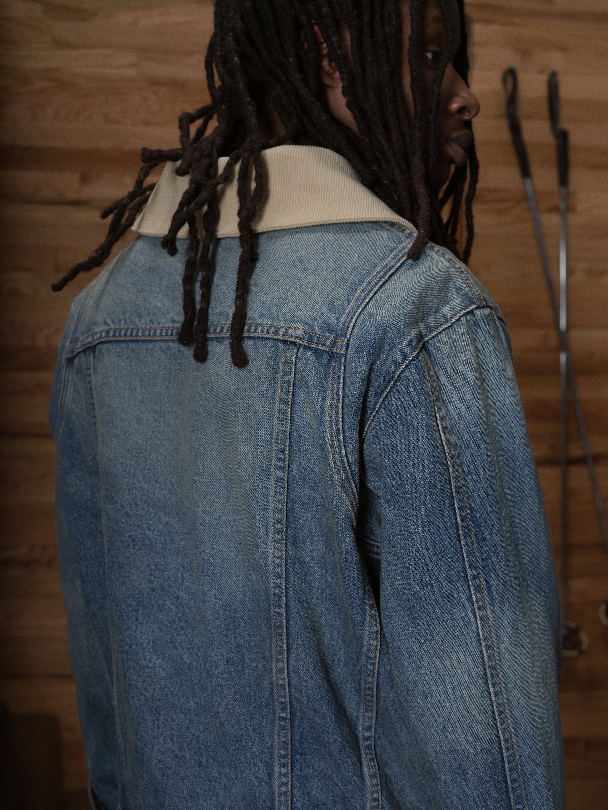 Luxurious denim jacket with a Western-inspired Rhude-stitched R logo, twin pockets, a corduroy collar, custom pill hardware, and a two-way zipper. Handcrafted in Los Angeles from premium materials.
